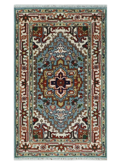 2x4 Aqua Blue and Ivory Wool Hand Knotted Traditional Vintage Antique Rug| N1424