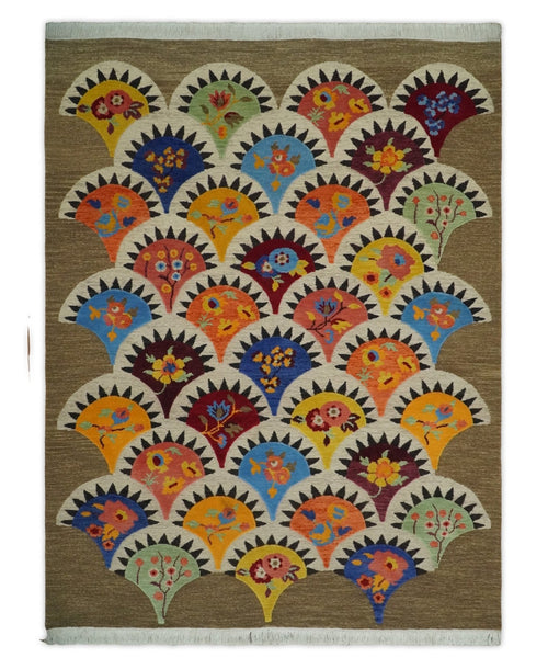 5x7 Flatwoven Soumak Brown and Ivory with multicolor Wool Hand Woven Floral Design Rug | KNT21