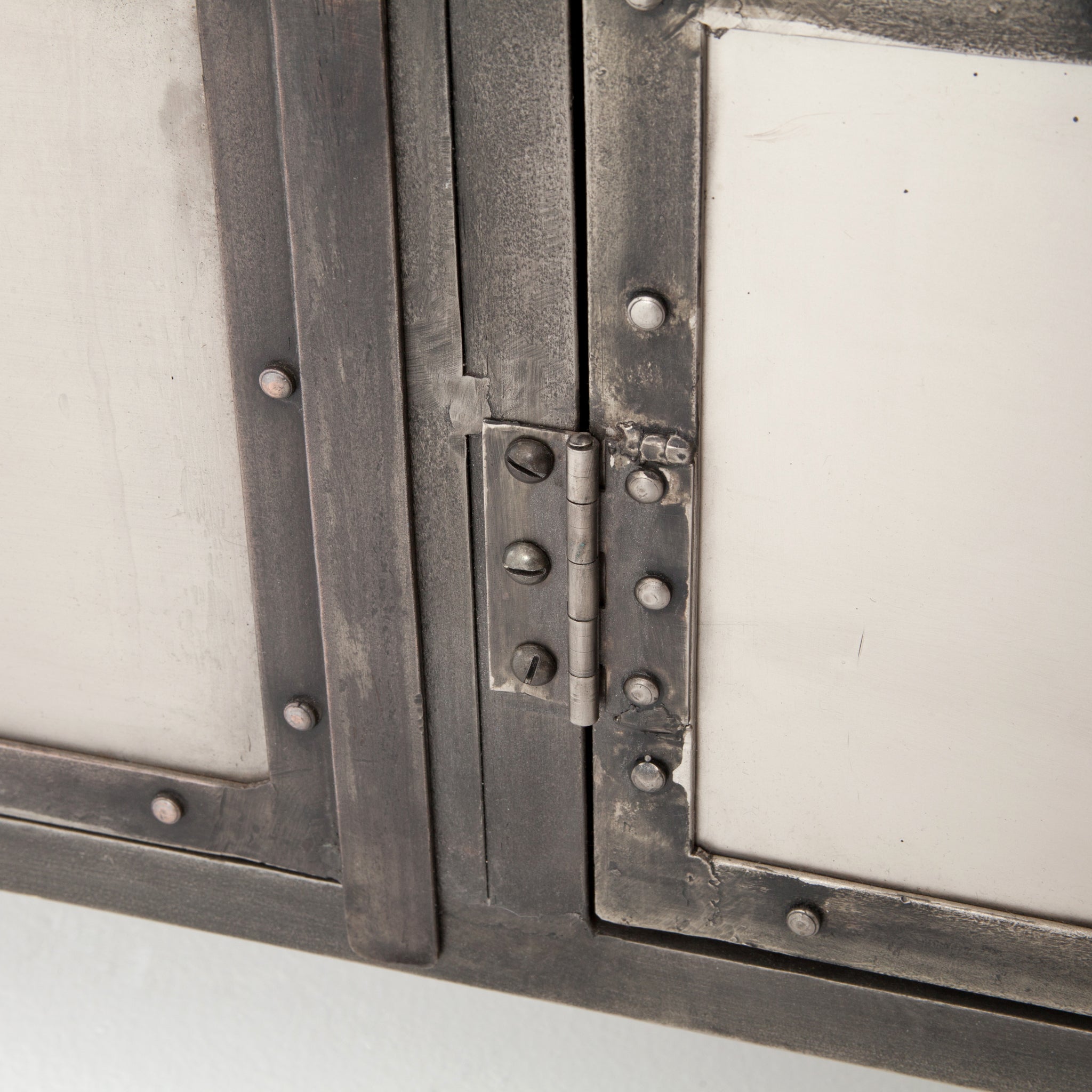 An industrial-strength console offers an intriguing home for modern media. Dark iron frame contrasts with antiqued nickel panels. Construction marks add to the character of the piece.