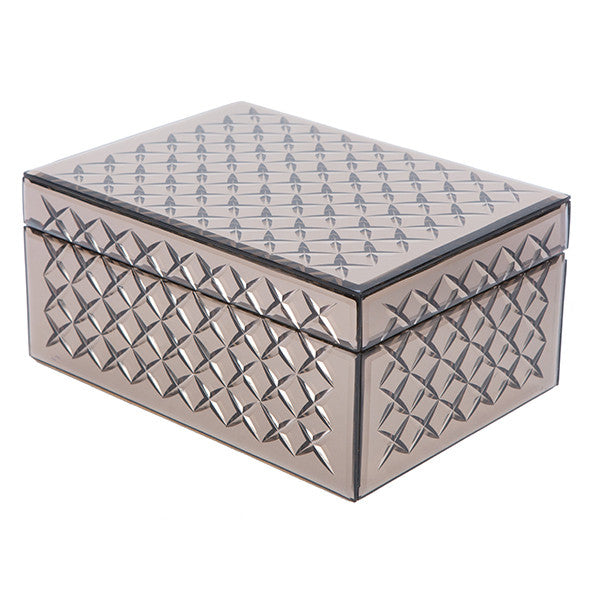Exhibiting the same elan as a quilted evening purse à la Coco Chanel, our Izzo jewelry box has elegant crosshatchings sculpted into the mirrored surface to make it a textural accent that also serves as a nest for some of your most prized possessions. The beveled edges on the glass, which glints in a pale brown sheen, makes this lovely box read like a tailored suit you’ll ornament with your favorite necklace and earrings inside.