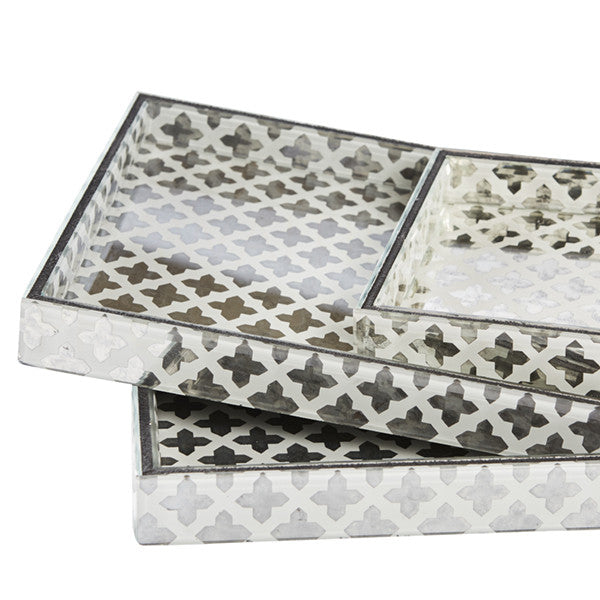 The quatrefoil motif on our Mary Tray Set brings a gothic dose of beauty to these decorative accents that are also useful in serving beverages during a party, storing files and papers at the office or gathering ideas for a creative project. The mirrored surfaces on which the cream pattern is stamped make these trays glint so beautifully, they’ll be lovely accoutrements even when they are nested and empty. Measurements of the trays are listed below.