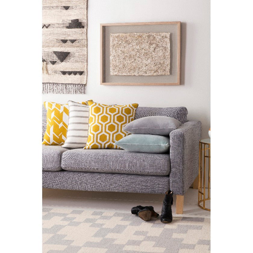 The Eendragt Saffron Pillow Cover is designed to make a statement. The geometric pattern, featuring bold saffron hexagons contrasted by crisp white lines and light gray accents, creates a dynamic and sophisticated look. Its vibrant saffron hue brings warmth and energy to your space, making it an ideal focal point for neutral-toned rooms or a complementary piece in colorful interiors. Whether used as a standalone accent or layered with other pillows, it effortlessly enhances the aesthetic of any living room, bedroom, or office.