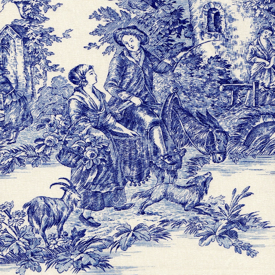 The perfect toile you've been searching for! These enchanting scenes of French country life are simply delightful. Dark blue on a light cream background.