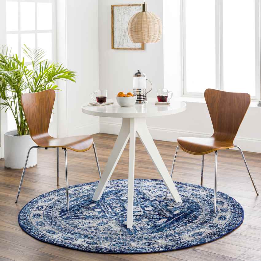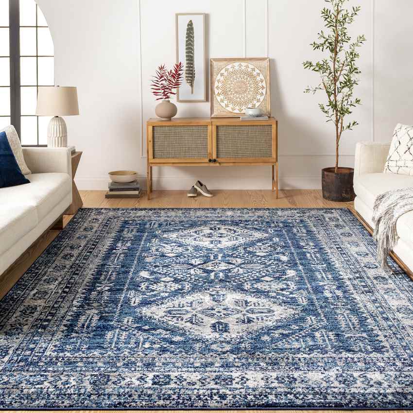 The Jules rug’s sophisticated color palette of navy, light gray, blue, and white makes it easy to style with various decor elements. This rug effortlessly blends with neutral furnishings, adding depth without overpowering the space. For a classic look, pair it with rich, warm woods and vintage-inspired furniture. Its balanced colors create a calm, welcoming ambiance, adding warmth to any room.