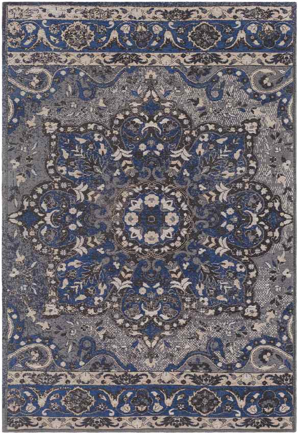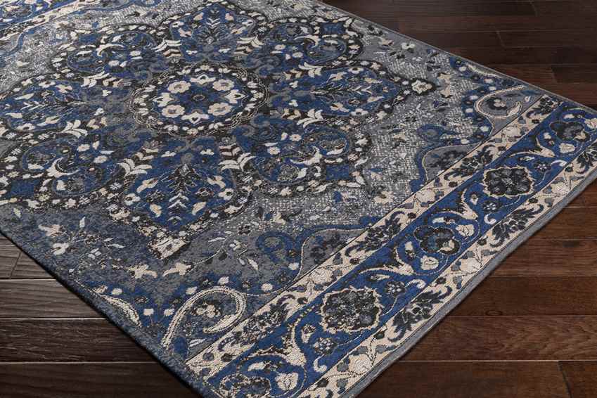 Introduce timeless sophistication to your home with the Kamsack Traditional Navy Area Rug, a masterpiece of intricate design and lasting durability. Featuring a rich color palette of navy, charcoal, medium gray, light gray, and taupe, this rug brings a sense of heritage and refined charm to any space. Handwoven in India from a premium blend of 75% chenille-polyester and 25% cotton, this no-pile rug offers a sleek finish while ensuring resilience against daily wear and tear.