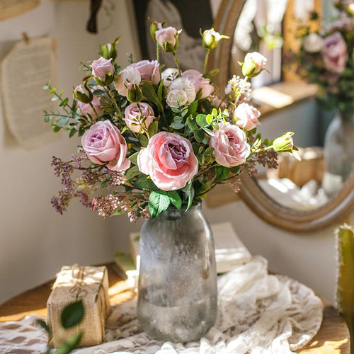 Artificial Silk Flower Bouquet Pink Rose 12" Tall