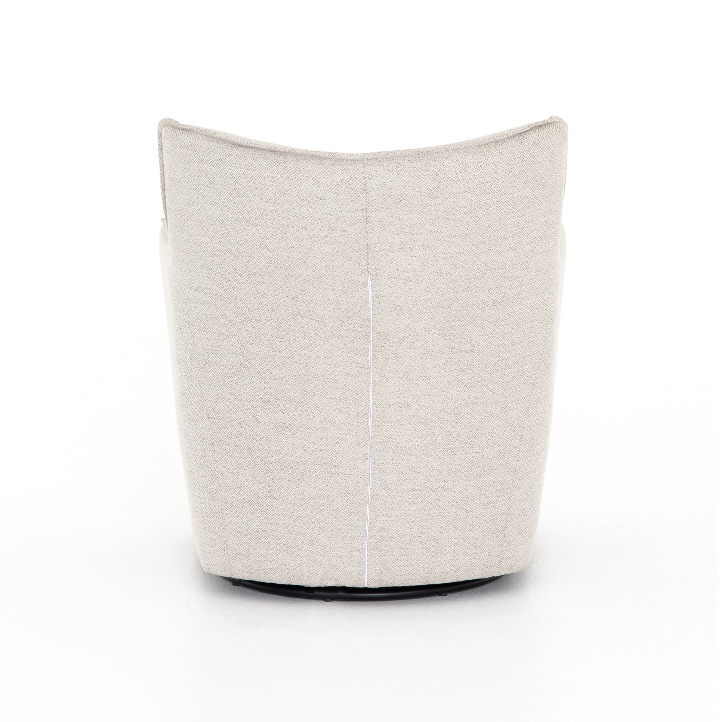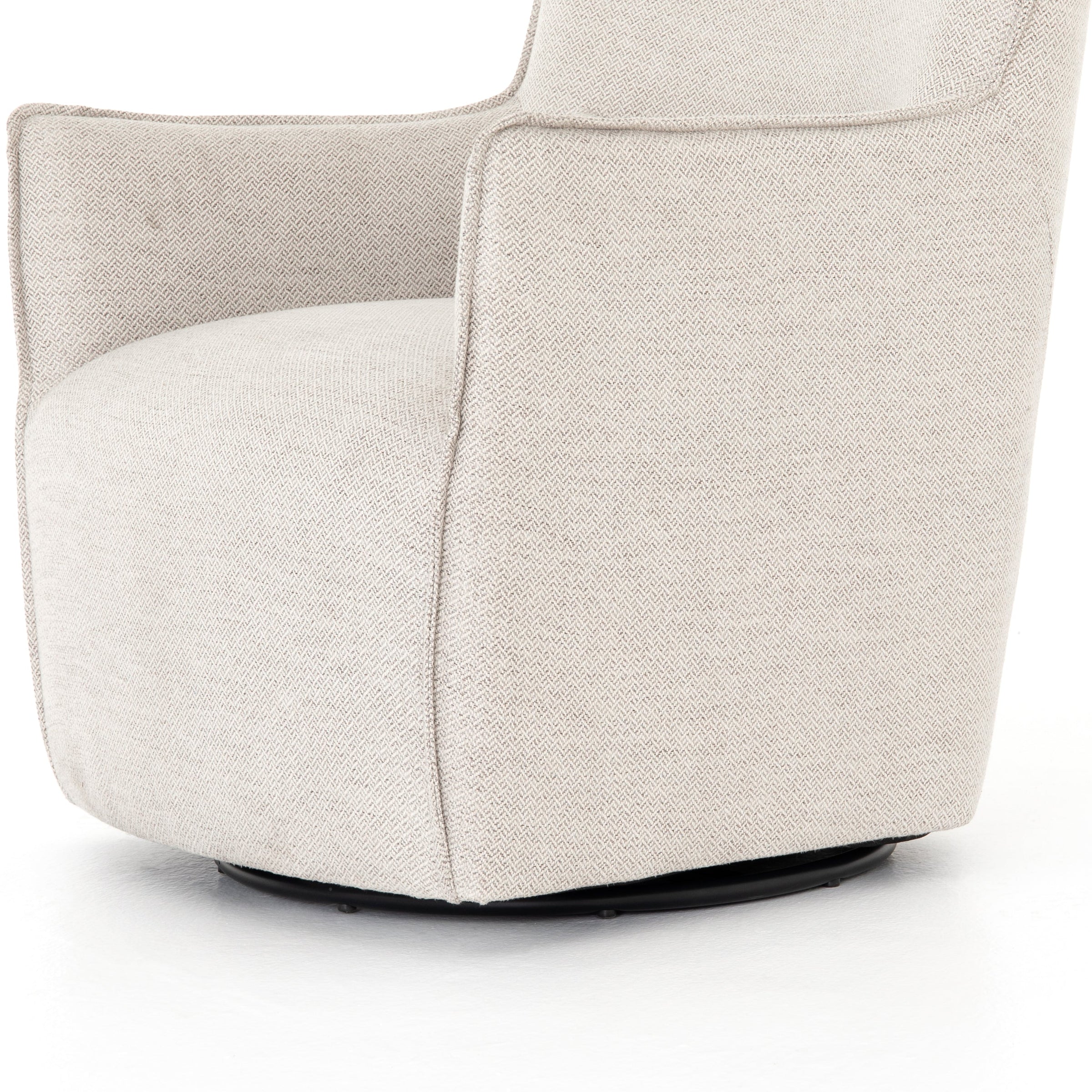 Expert tailoring on this Kimble Swivel - Noble Platinum creates a clean, sophisticated look, rich with come-hither comfort. A tight sit and barrel shape is softened via flange seam detailing and swivel feature and finished off with a petite lumbar cushion, for the perfect mix of shape and function for any living room or baby room.