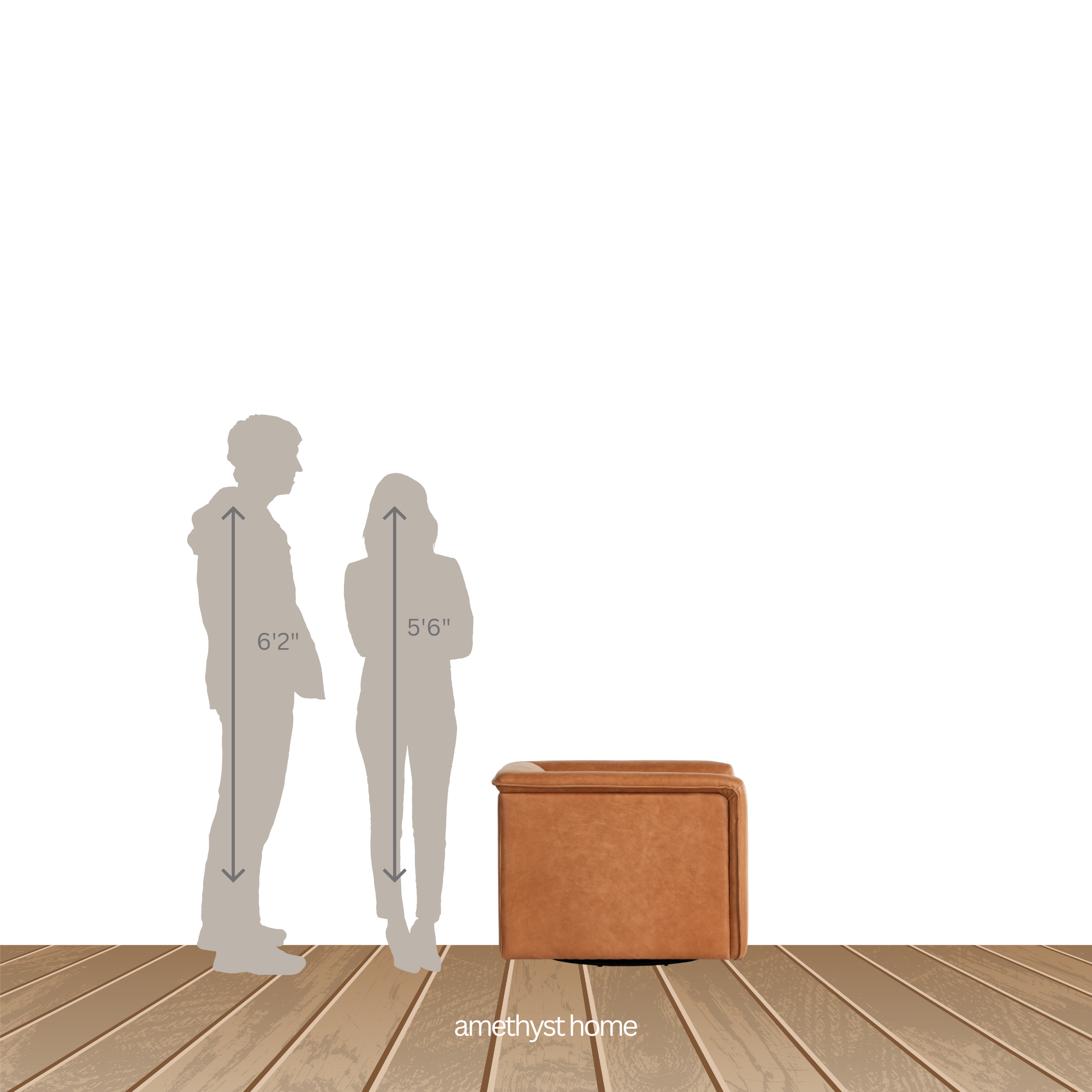 Inspired by 70s vintage seating and plush duvet toppers, a structured, supportive seat is covered in a Four Hands-exclusive top-grain leather in a rich cognac tone. A 360-degree swivel modernizes this vintage-leaning look.