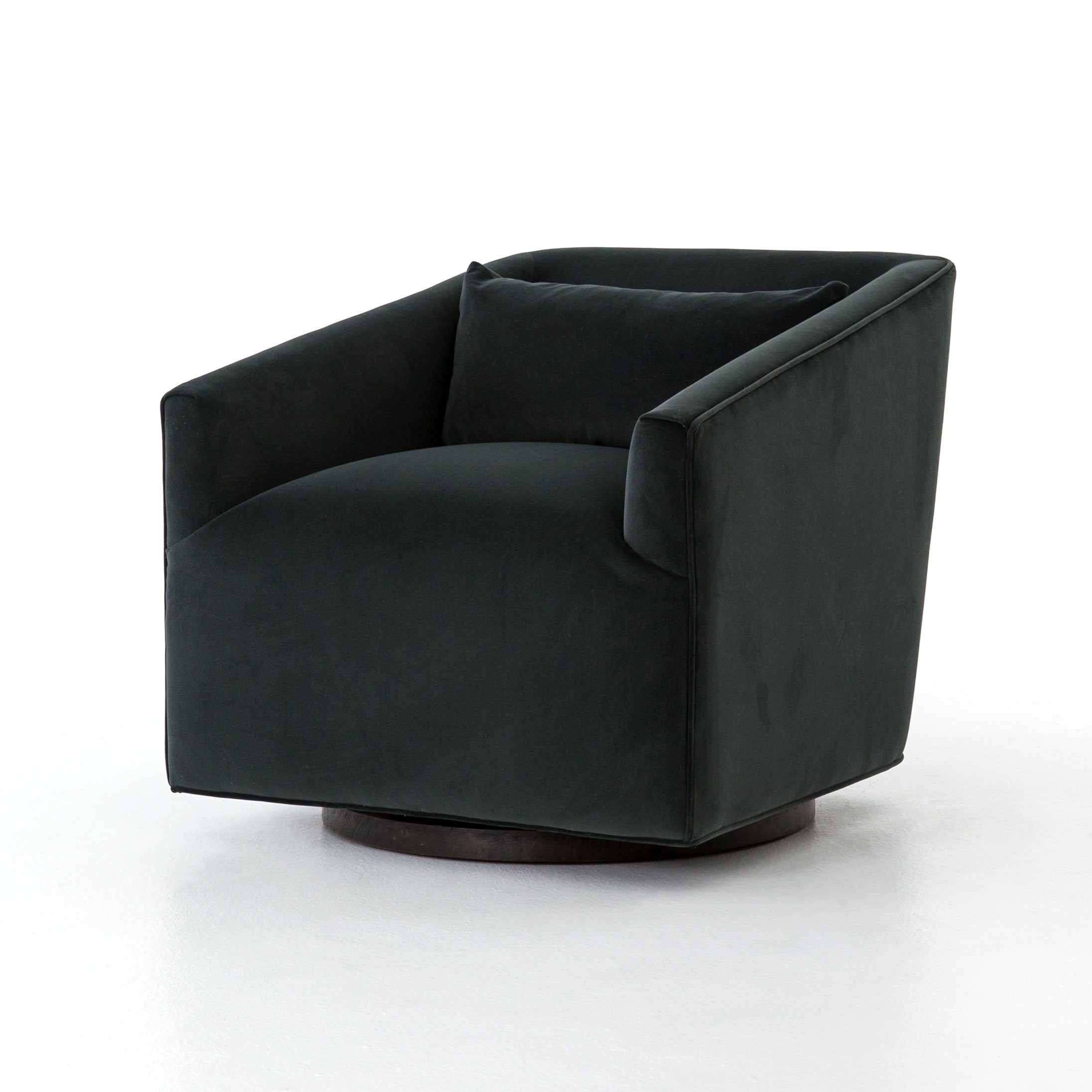 The York Swivel Chair is small in scale, but substantial in comfort. The chair's precisely-tailored seating in a modern smoky velvet offers a touch of light swivel movement. The base of the chair has a moss-tinged charcoal hue adding a fashion-forward twist. This chair would be a great addition to an office, living room, or bedroom.
