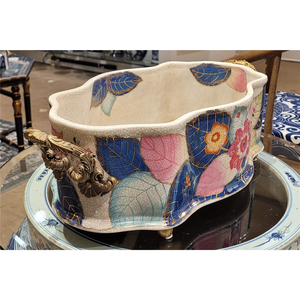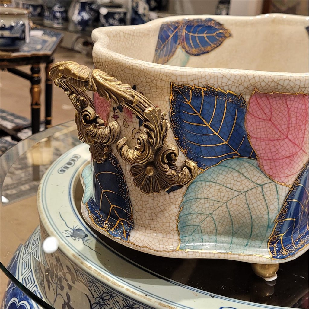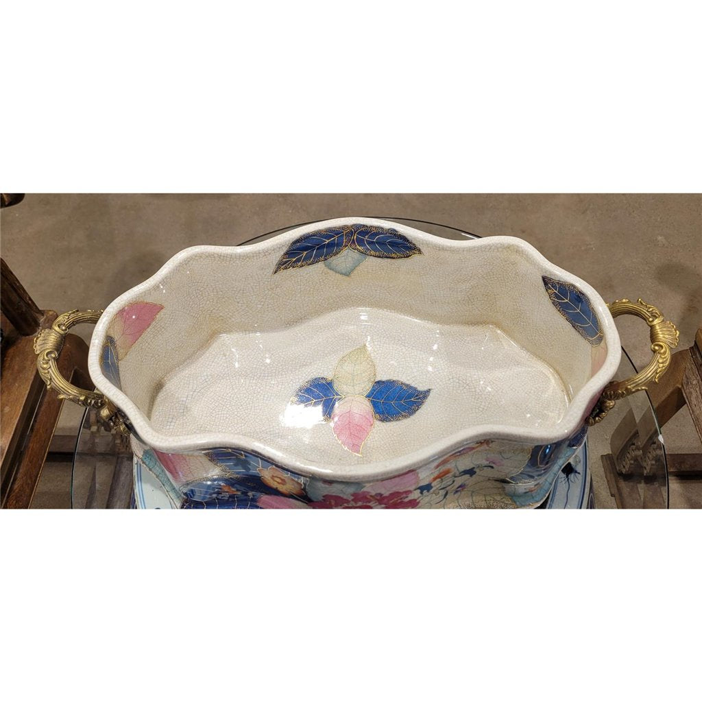 Elevate your bathroom or powder room with this exquisite porcelain basin, featuring an authentic tobacco leaf pattern rendered in rich, warm tones. Hand-glazed with real gold accents, the delicate botanical design captures timeless elegance and sophistication. Crafted from fine porcelain and adorned with ornate bronze ormolu hardware, this piece serves as both a functional footbath and a striking decorative accent. The generous 22" length accommodates everyday use while the refined detailing makes it a conversation-starting focal point. Perfect for vintage-inspired interiors, eclectic bathrooms, or collectors who appreciate artisanal craftsmanship. The gold-glazed finish catches light beautifully, adding warmth and luxury to any space.