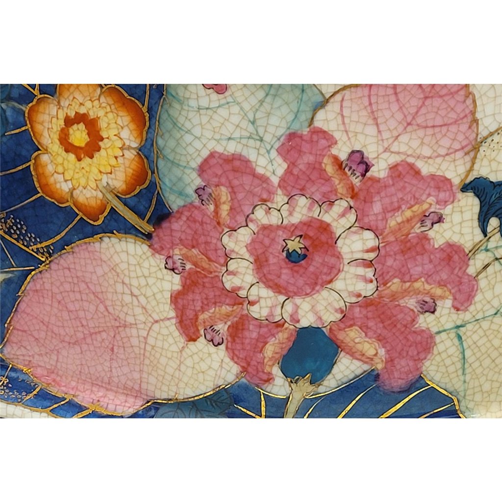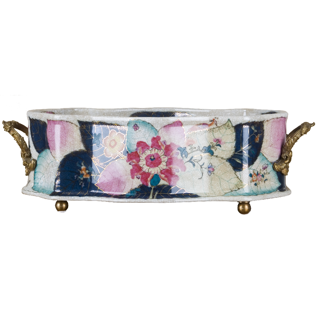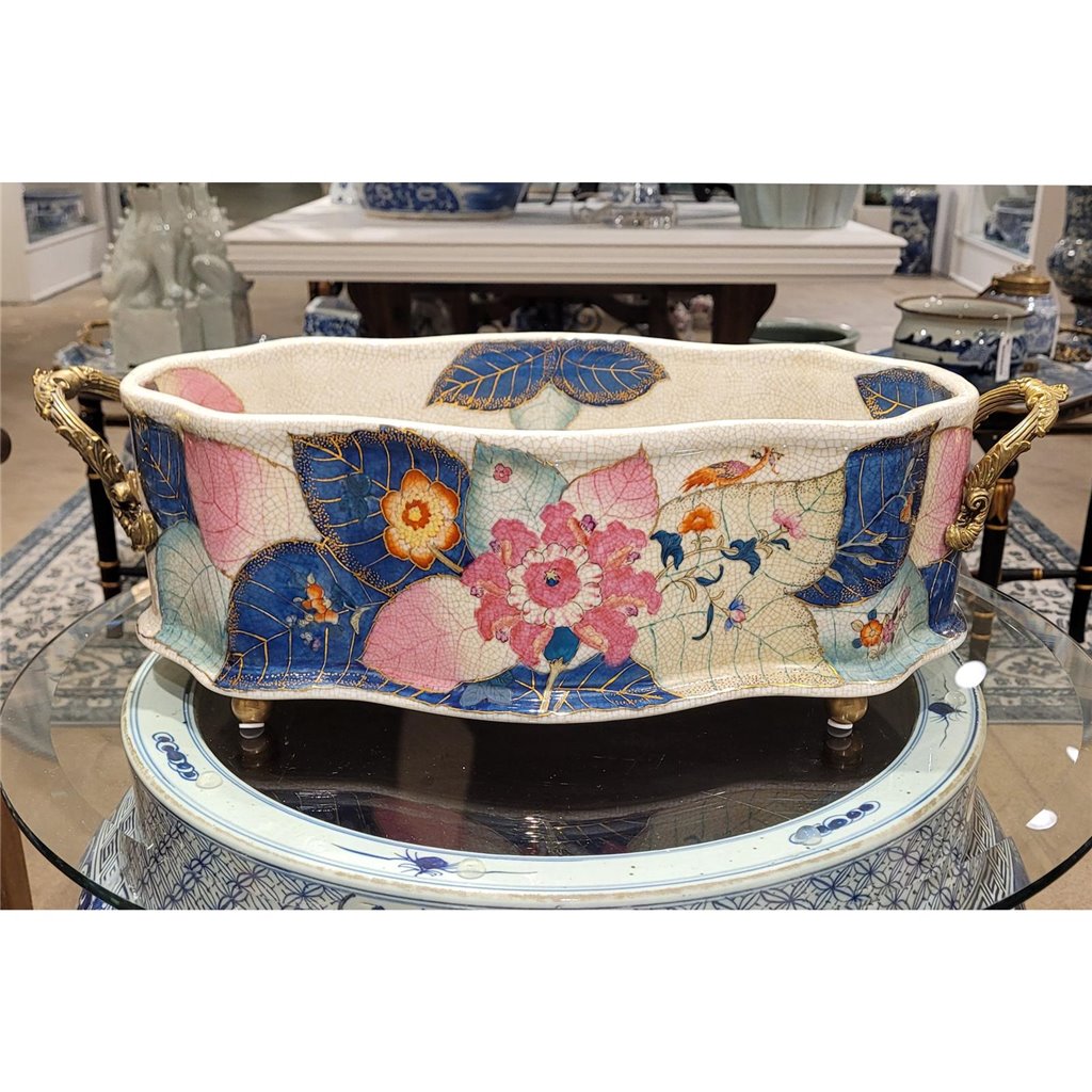 Elevate your bathroom or powder room with this exquisite porcelain basin, featuring an authentic tobacco leaf pattern rendered in rich, warm tones. Hand-glazed with real gold accents, the delicate botanical design captures timeless elegance and sophistication. Crafted from fine porcelain and adorned with ornate bronze ormolu hardware, this piece serves as both a functional footbath and a striking decorative accent. The generous 22" length accommodates everyday use while the refined detailing makes it a conversation-starting focal point. Perfect for vintage-inspired interiors, eclectic bathrooms, or collectors who appreciate artisanal craftsmanship. The gold-glazed finish catches light beautifully, adding warmth and luxury to any space.