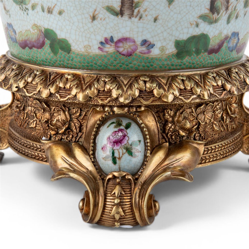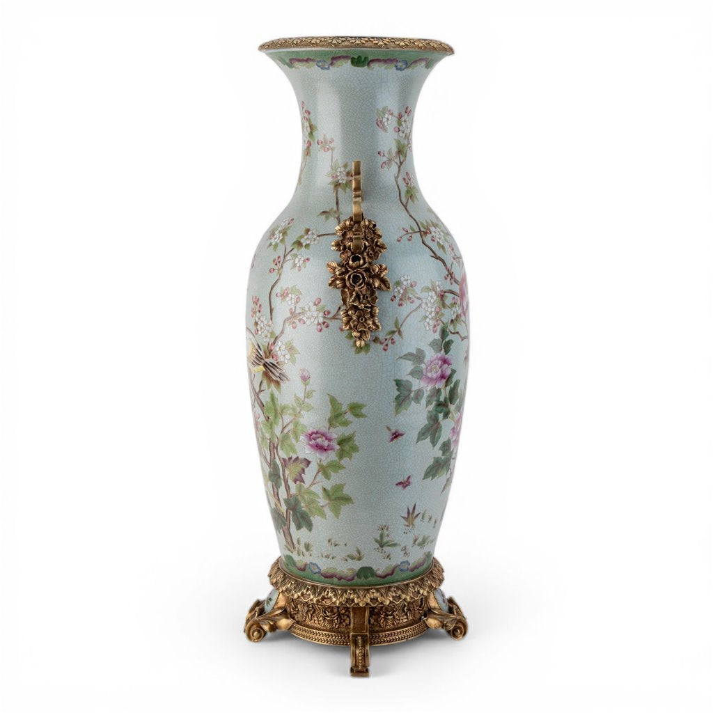 Elevate your décor with this stunning porcelain vase, featuring hand-painted aviary scenes and delicate flowering branches on a soft celadon crackle finish. Ornate bronze ormolu accents and an intricately detailed pedestal base showcase traditional craftsmanship with European sophistication. A distinguished collector's piece that brings timeless elegance to any refined interior space.