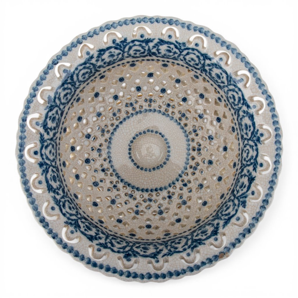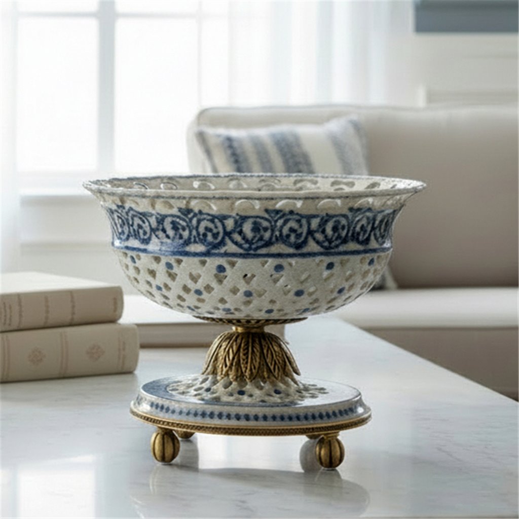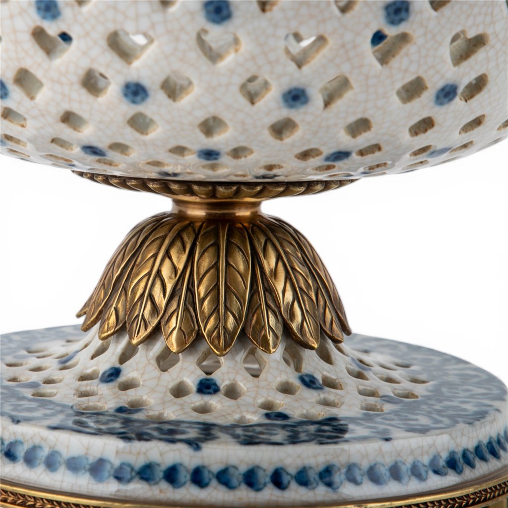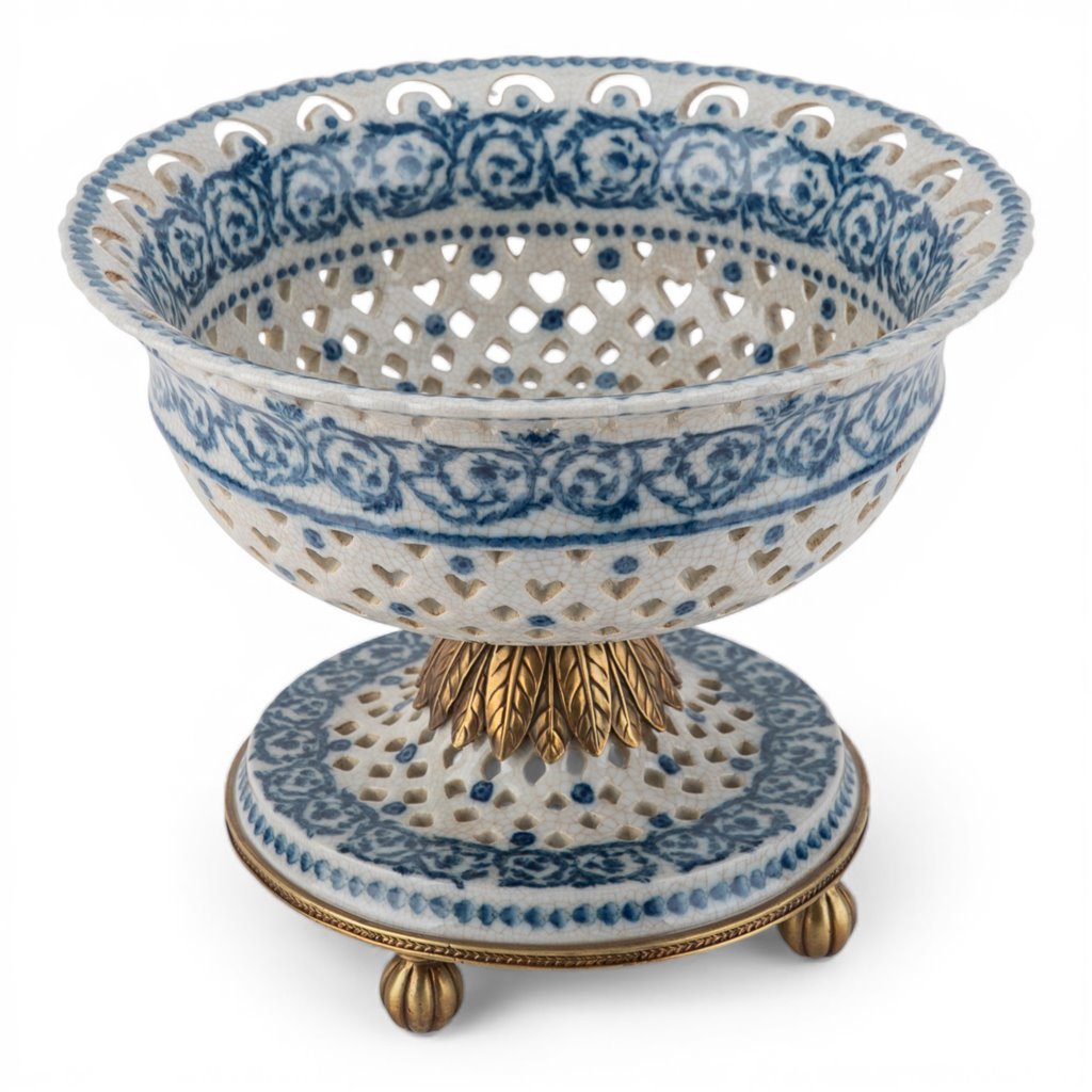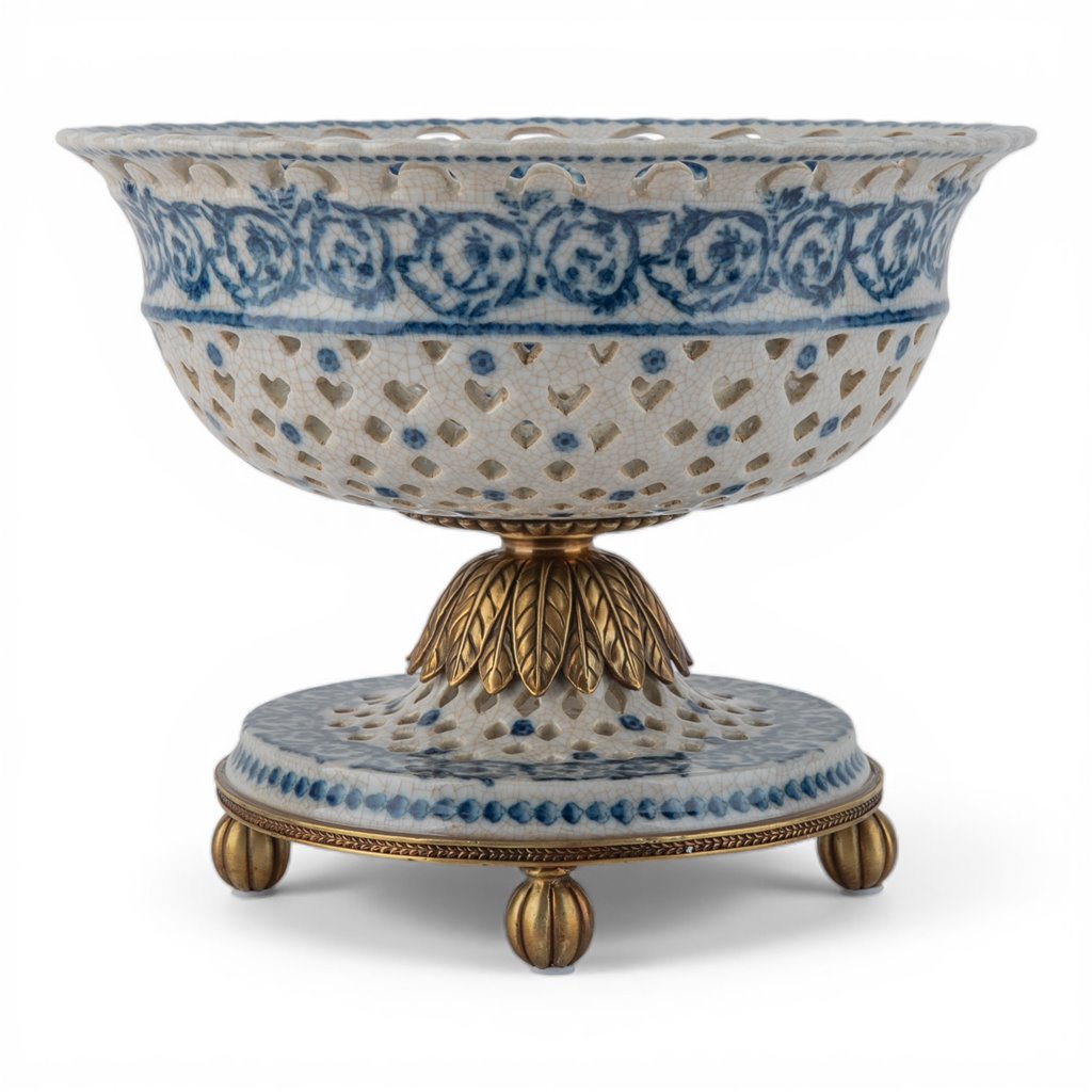 An exquisite pierced porcelain pedestal bowl that marries delicate craftsmanship with timeless elegance. Hand-painted blue scroll detailing adorns the intricately openwork design, while the bronze ormolu base adds a luxurious gilt accent. The airy pierced pattern creates visual lightness without sacrificing presence, making it an ideal showcase for decorative spheres, potpourri, or fresh botanicals. A sophisticated statement piece that elevates any shelf, console, or dining display with refined architectural detail and old-world charm.