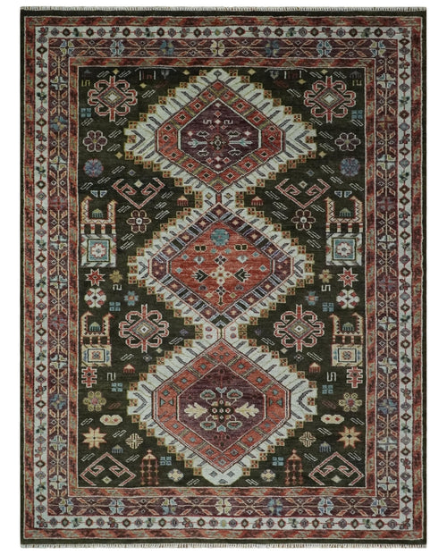 Teal, Ivory and Olive Hand Knotted Traditional Heriz Multi Size Wool Area Rug
