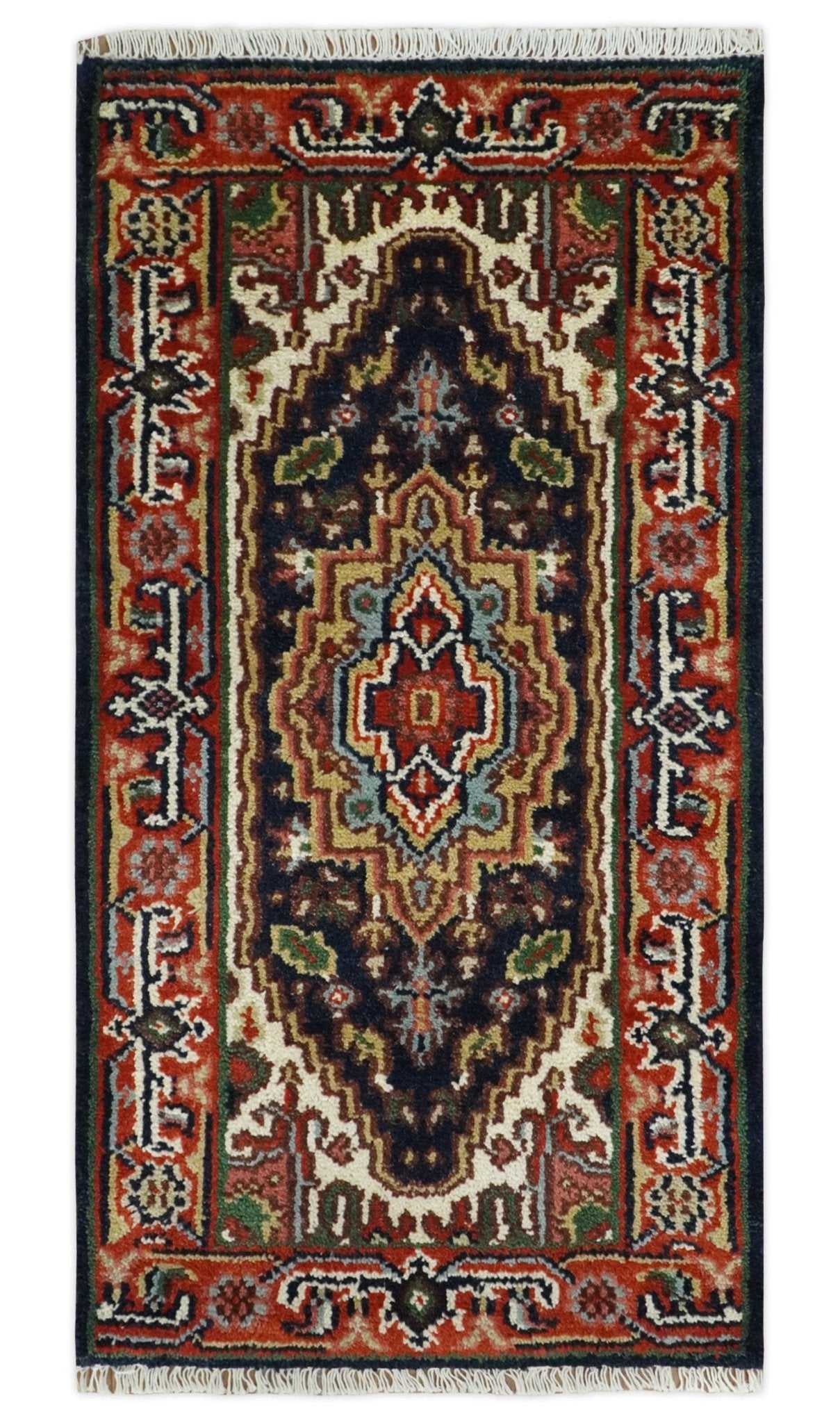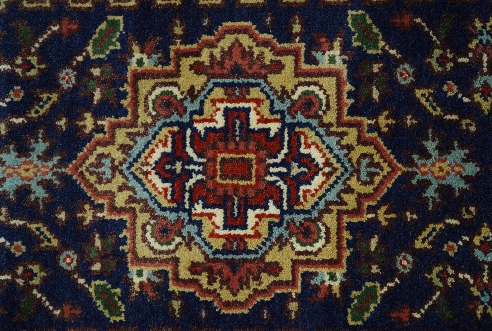 This specific rug is made in India, in the city of Bhadohi. Bhadohi is one of the biggest rug manufacturing cities. Carpet weaving in the region dates back to the 16th century during the reign of Akbar. The skilled artisans of Bhadohi have been carrying the tradition of rug-making for centuries.