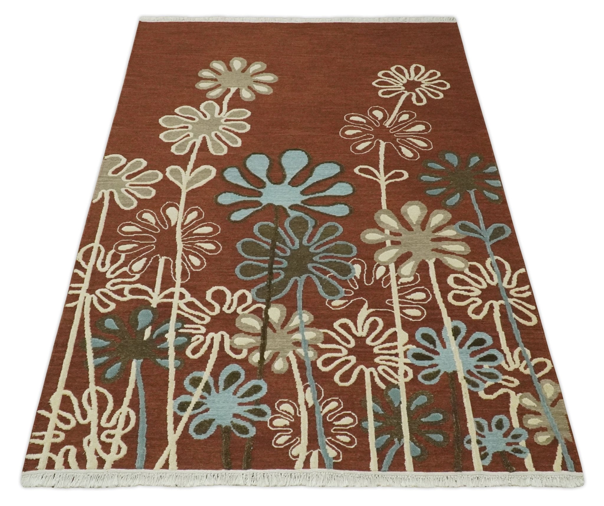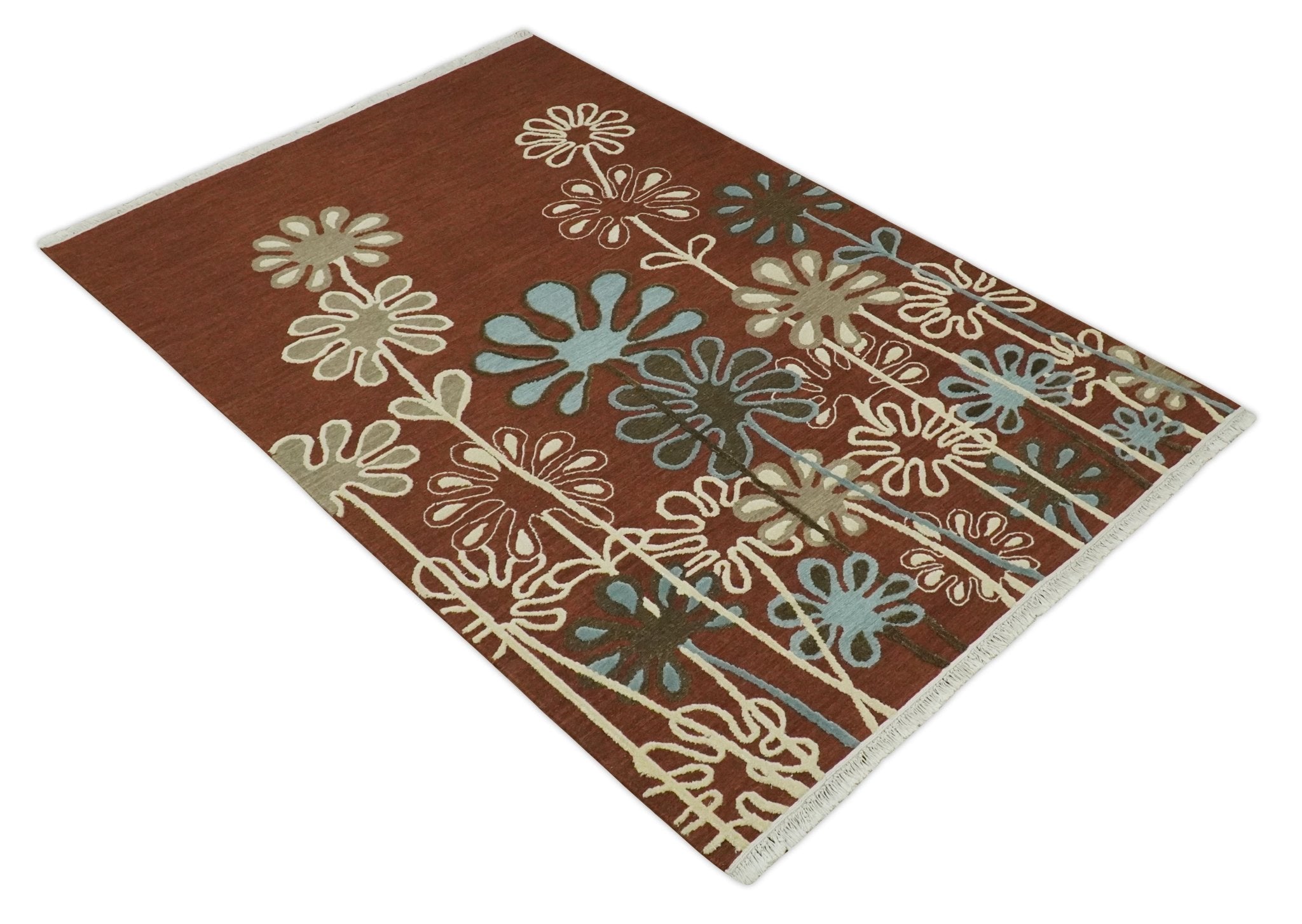 5x8 Brown, Camel and Silver Floral Pattern Flatwoven Soumak Weaver Farmhouse Wool Area Rug