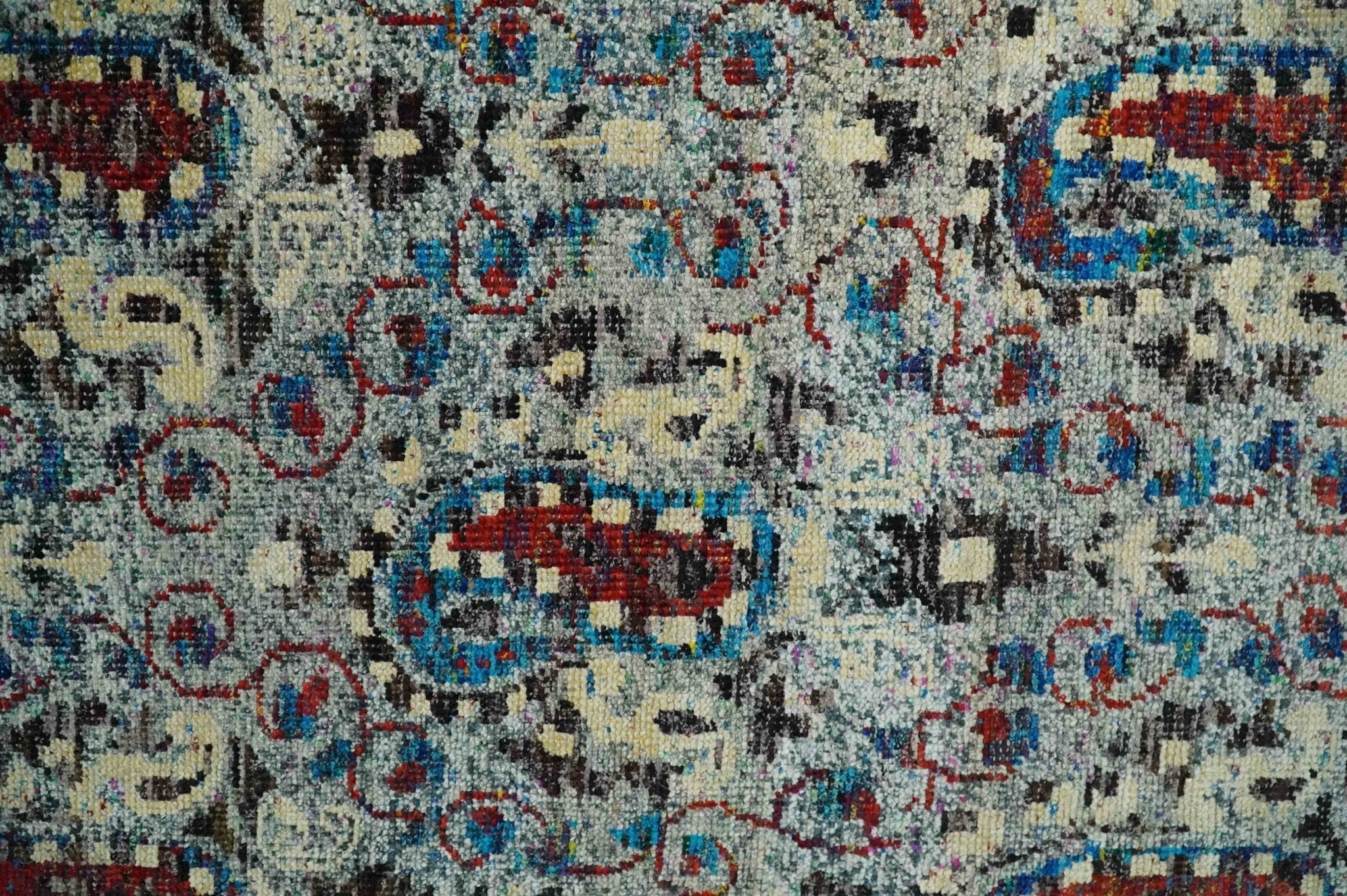 This specific rug is made in India, in the city of Bhadohi. Bhadohi is one of the biggest rug manufacturing cities. Carpet weaving in the region dates back to the 16th century during the reign of Akbar. The skilled artisans of Bhadohi have been carrying the tradition of rug-making for centuries.