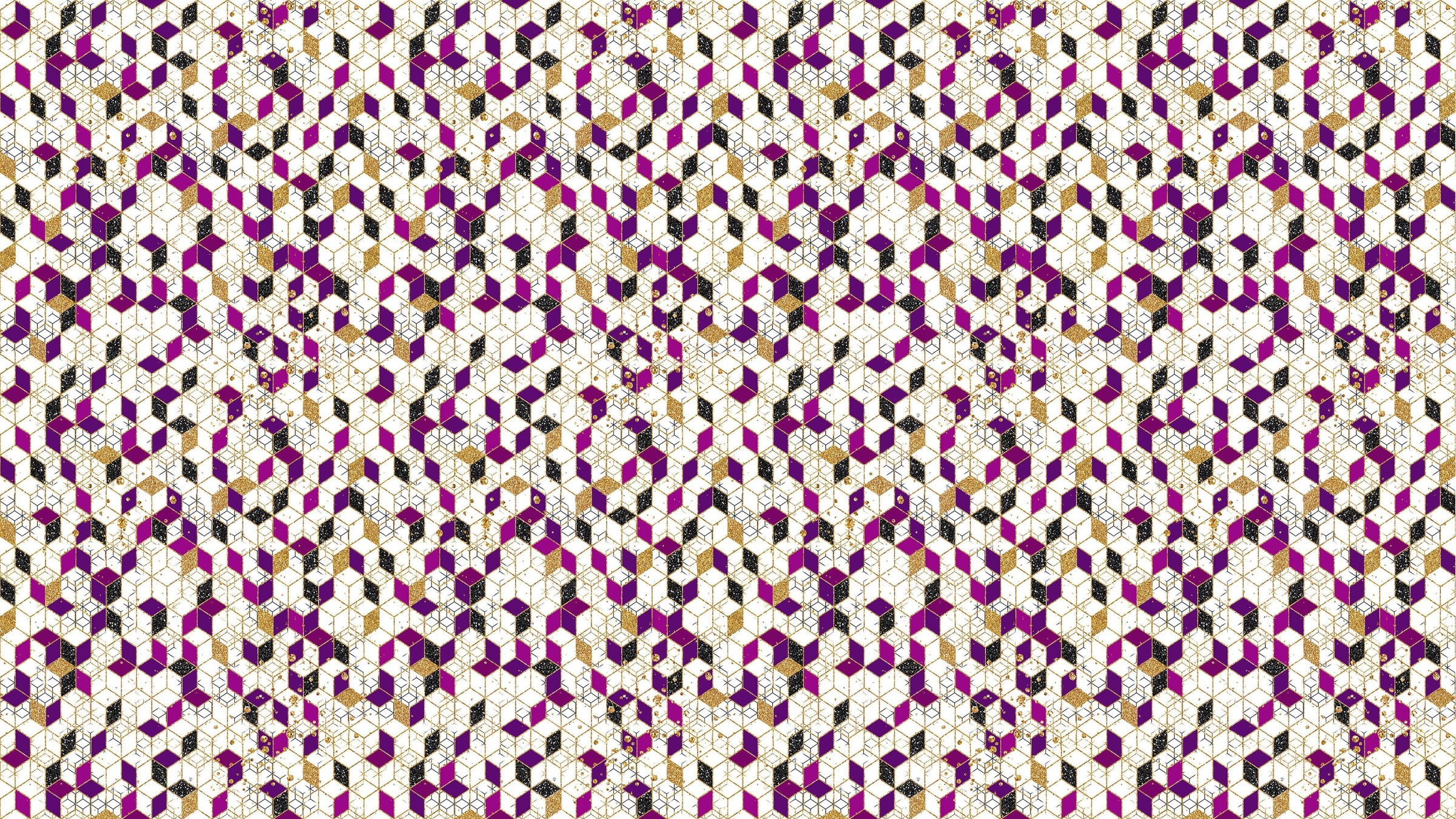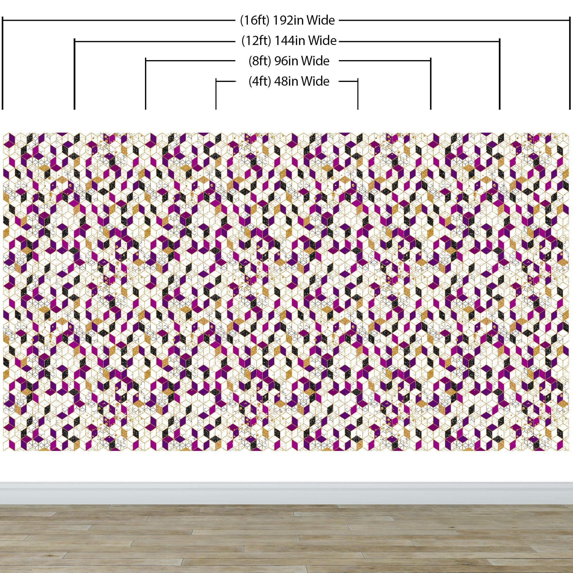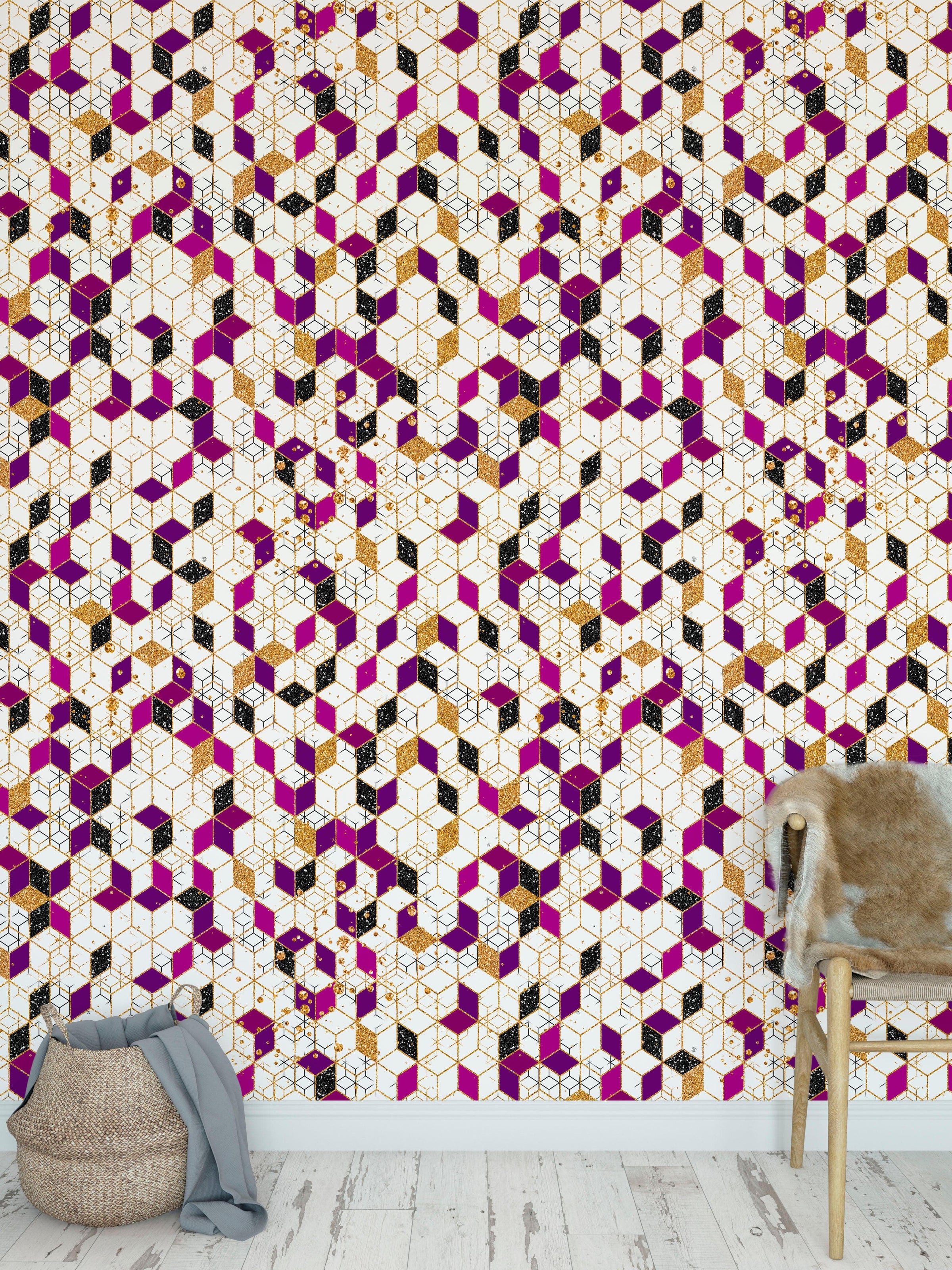 Abstract 3D Cube Shape Wall Mural. Geometric Cube Minimalistic Purple and Gold Peel and Stick Wallpaper. #6380