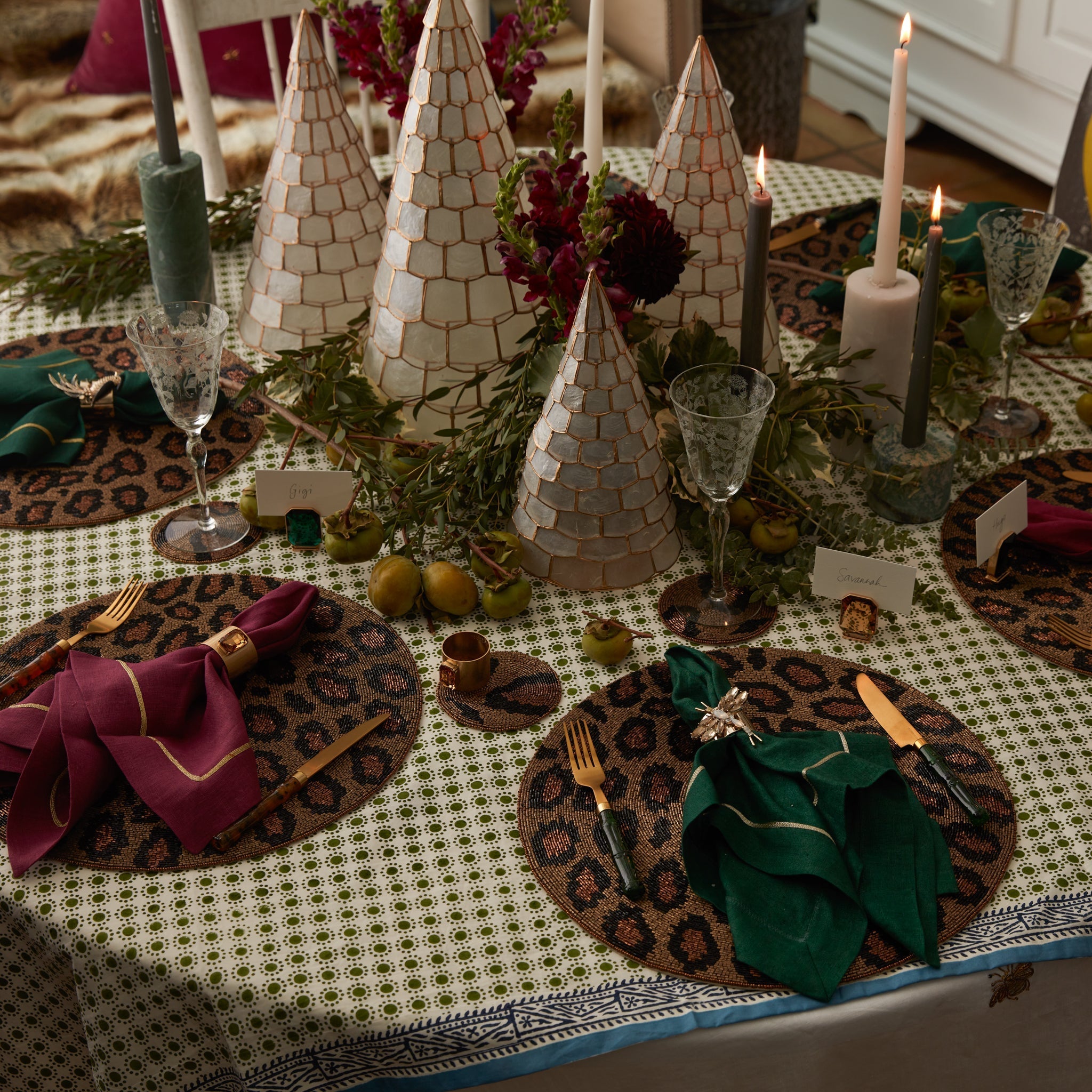 I love gold and grey together... so this colourway of our animal placemat seemed super obvious to me. Animal print is HUGE love of mine and I have been working on this idea of a beaded animal pattern for some time...and wanted the look to be very chic but also rich and dimensional. This is a perfect neutral backdrop for so many china patterns out there... I hope you love it!