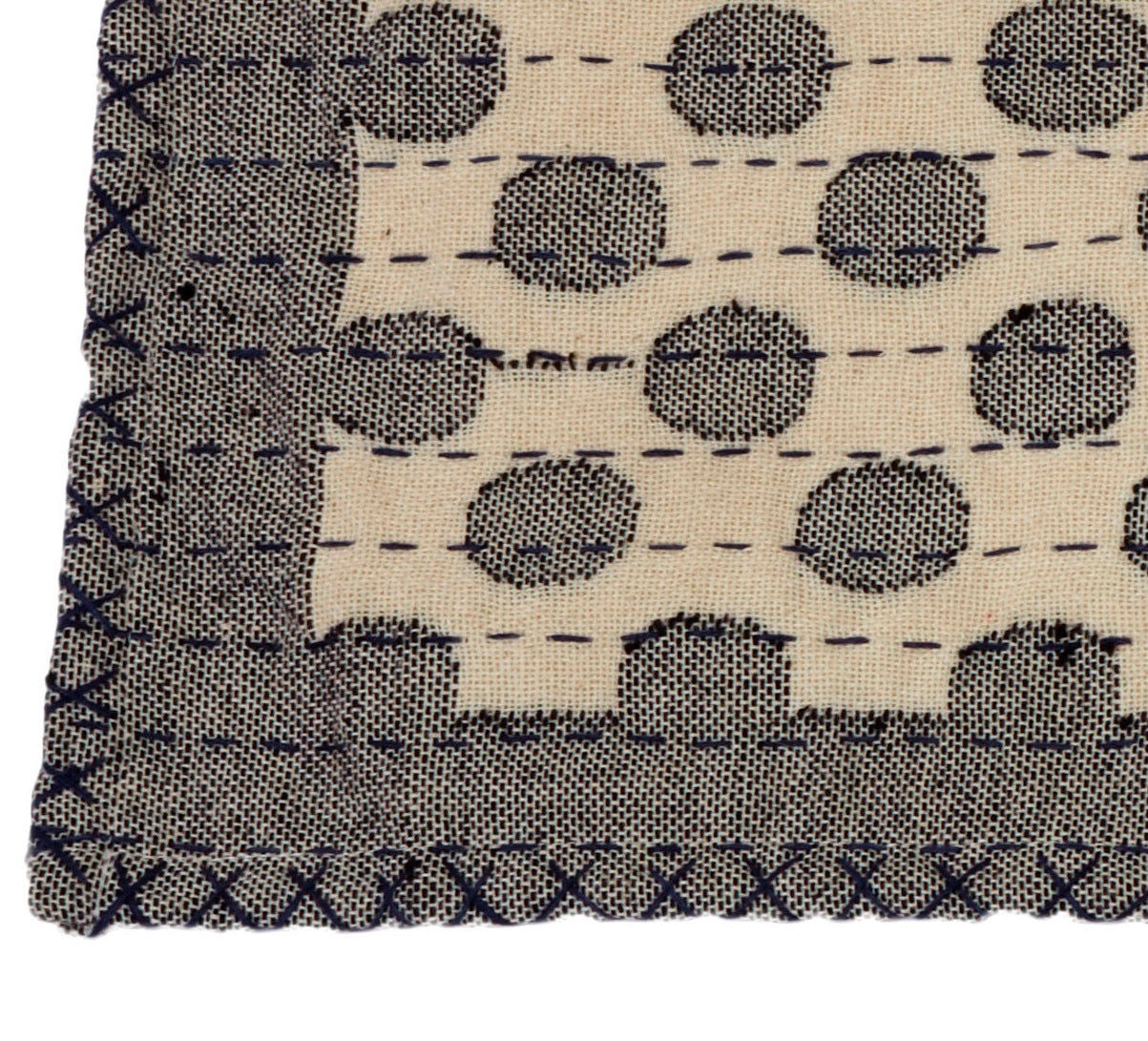 The creation of this design involves spinning and weaving hand-dyed cotton using artisan techniques that have been passed down through generations. Hand-sewn kantha stitching is the finishing touch. The craftsmanship involved at each stage of hand-dying, hand-spinning, hand-looming, hand-cutting, and hand-sewing ensures that every finished piece is truly one-of-a-kind.