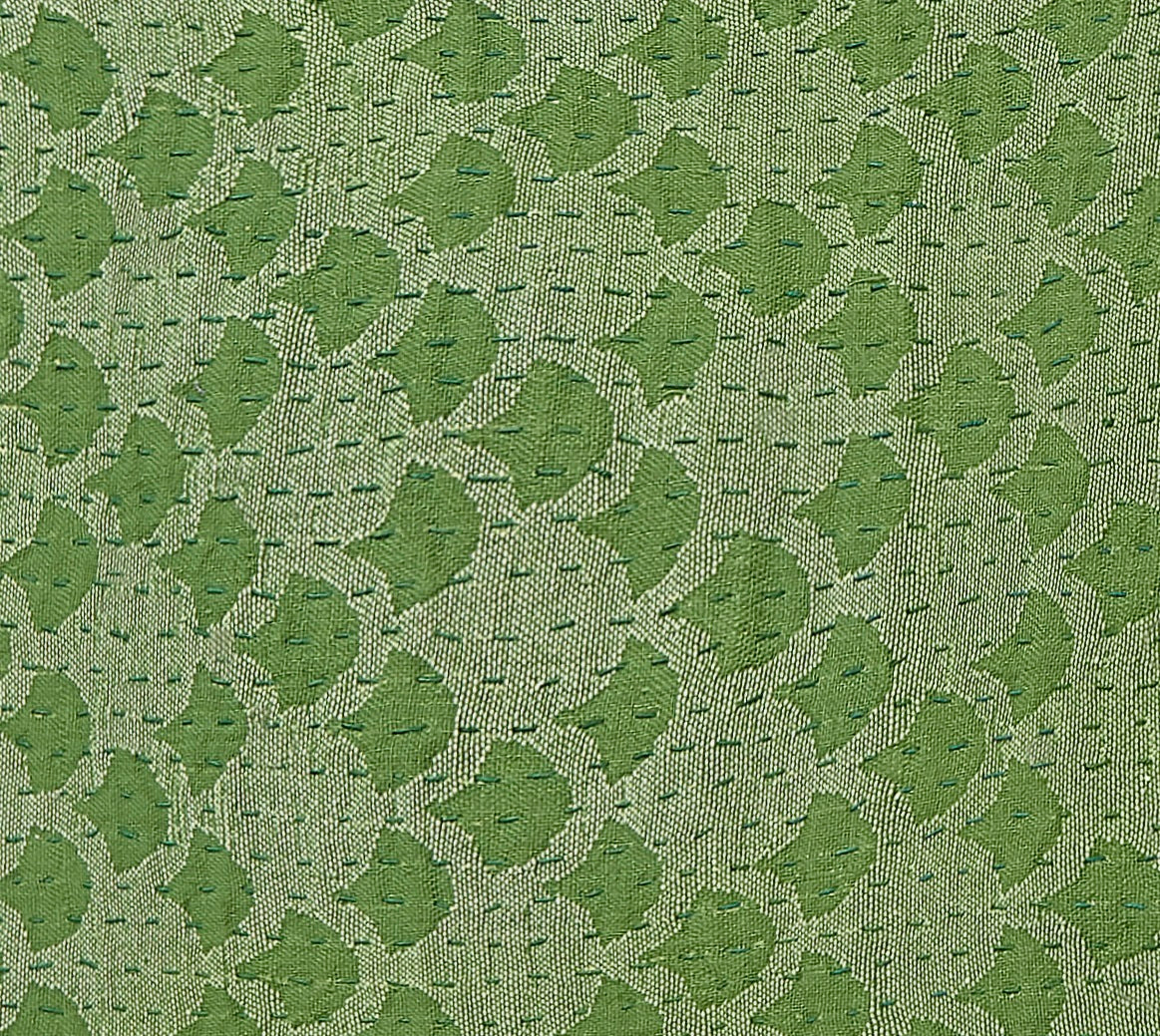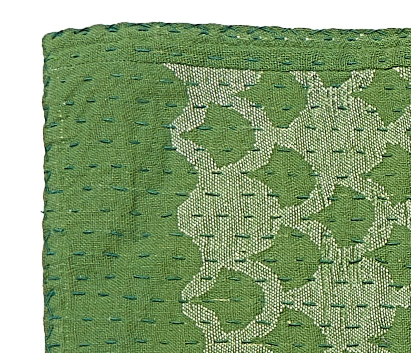 Let this inviting runner welcome you and your dinner party to a beautiful table, whether you are dining indoors or al fresco. Gorgeous color, contemporary pattern, and the evidence of artisan’s hand combine to make this a conversation piece that feels special, fresh, and elegant. Green stitching runs across the hand-loomed green ginkgo pattern. Lined with natural color linen.