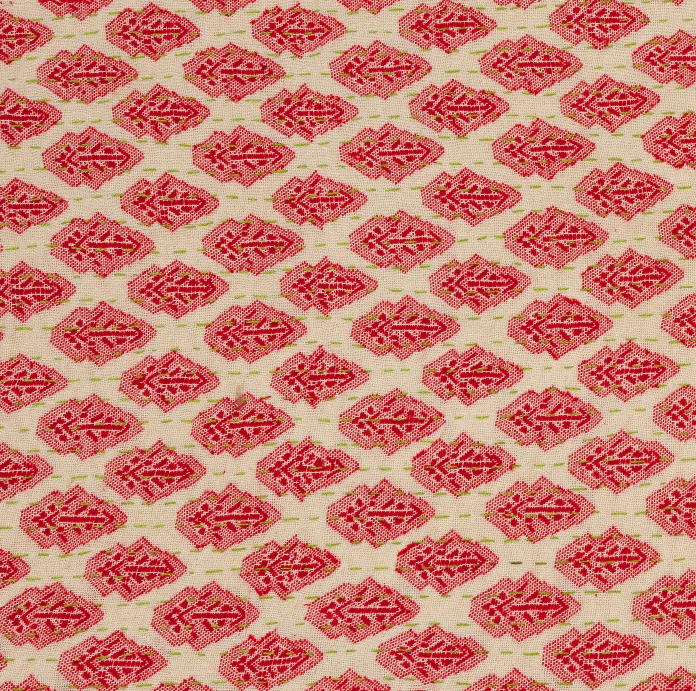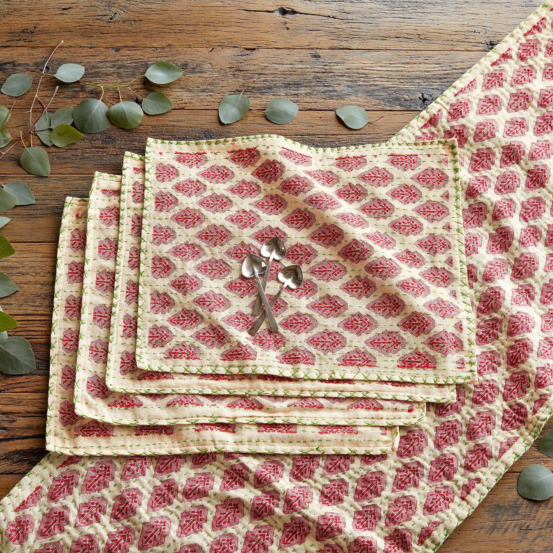 Let this inviting runner welcome you and your dinner party to a beautiful table, whether you are dining indoors or al fresco. Gorgeous color, contemporary pattern, and the evidence of artisan’s hand combine to make this a conversation piece that feels special, fresh, and elegant. Green stitching runs across the red hand-loomed patterning.