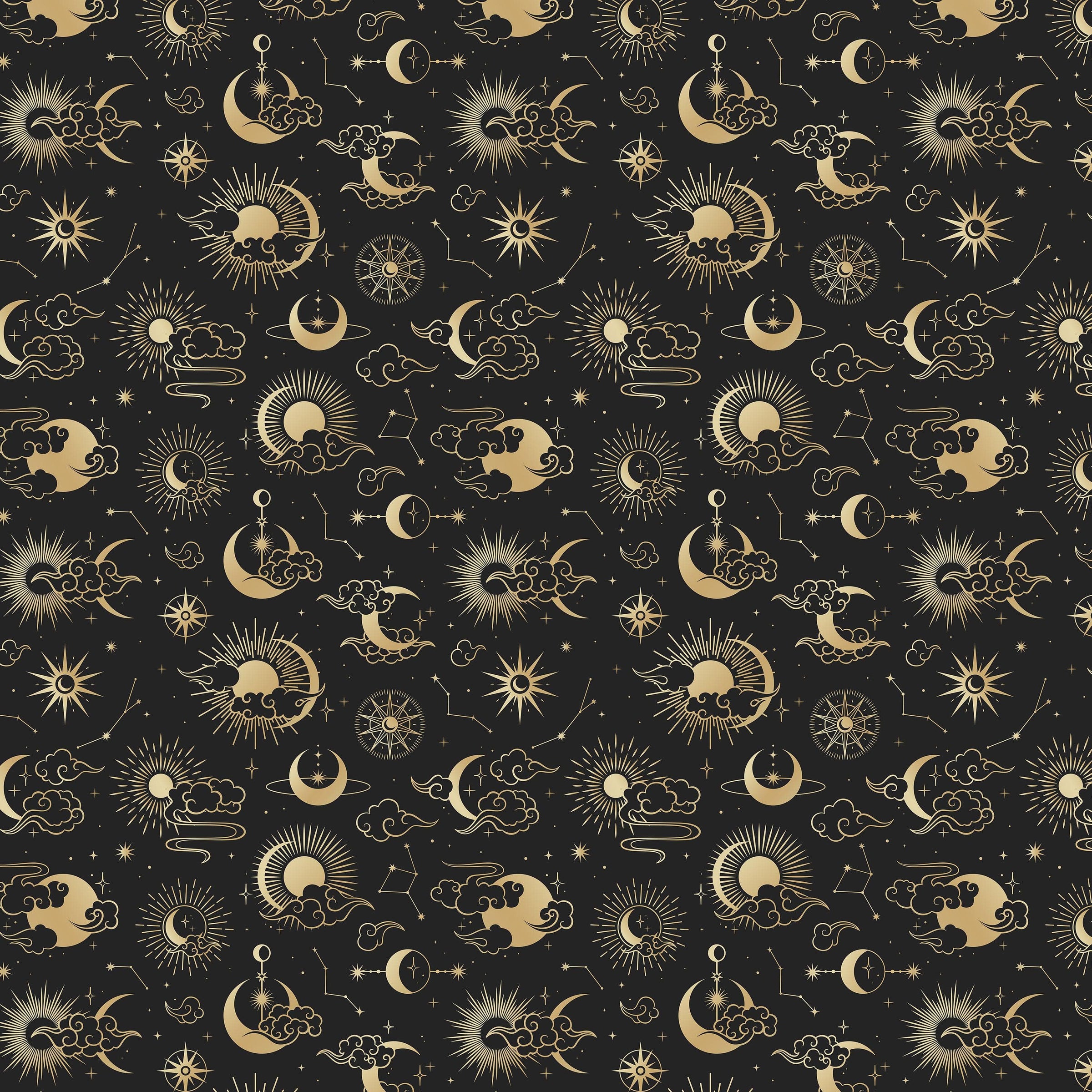 • Constellation Zodiac Horoscope Pattern Design. Golden Stars, Sun, Moon and Clouds over Night time Black background.