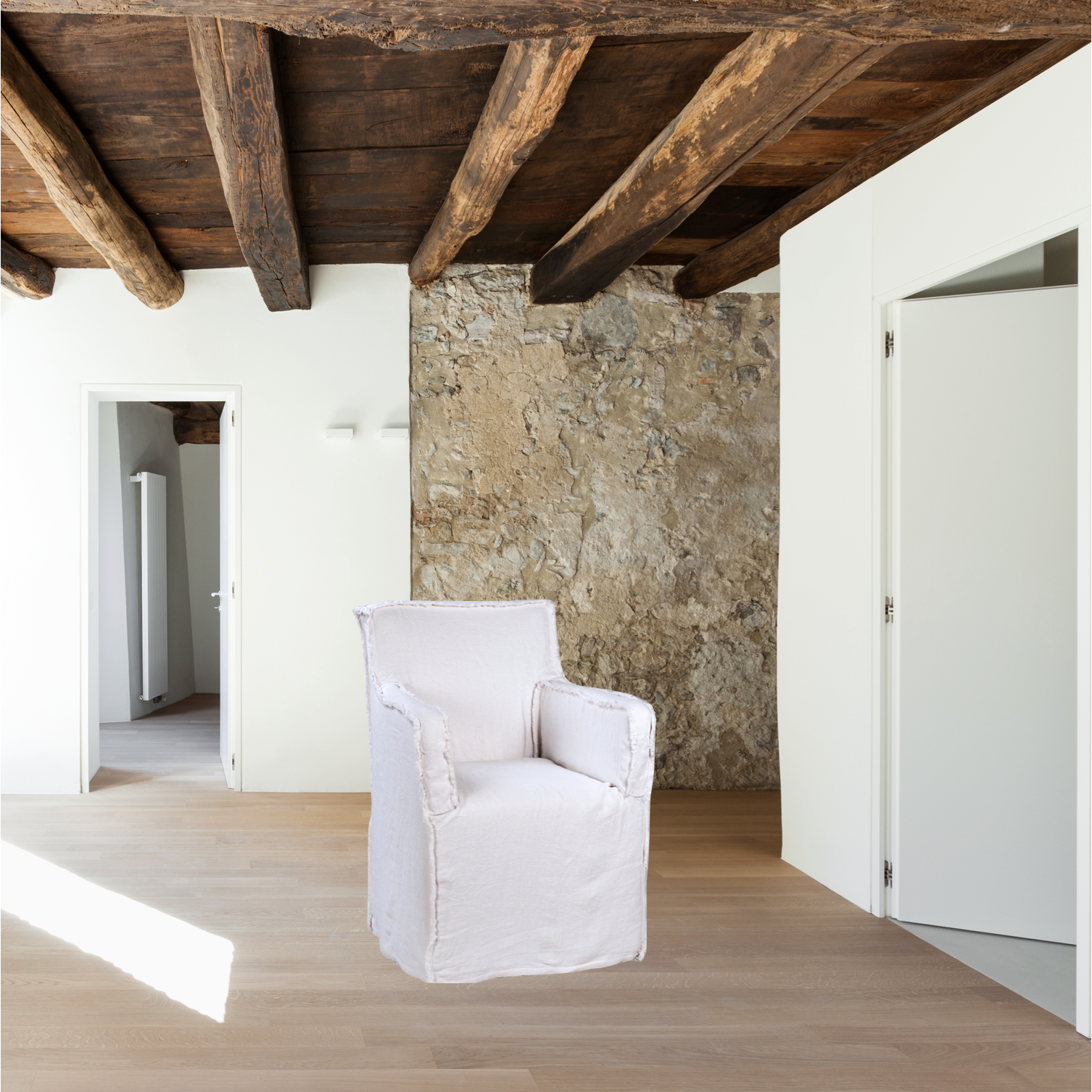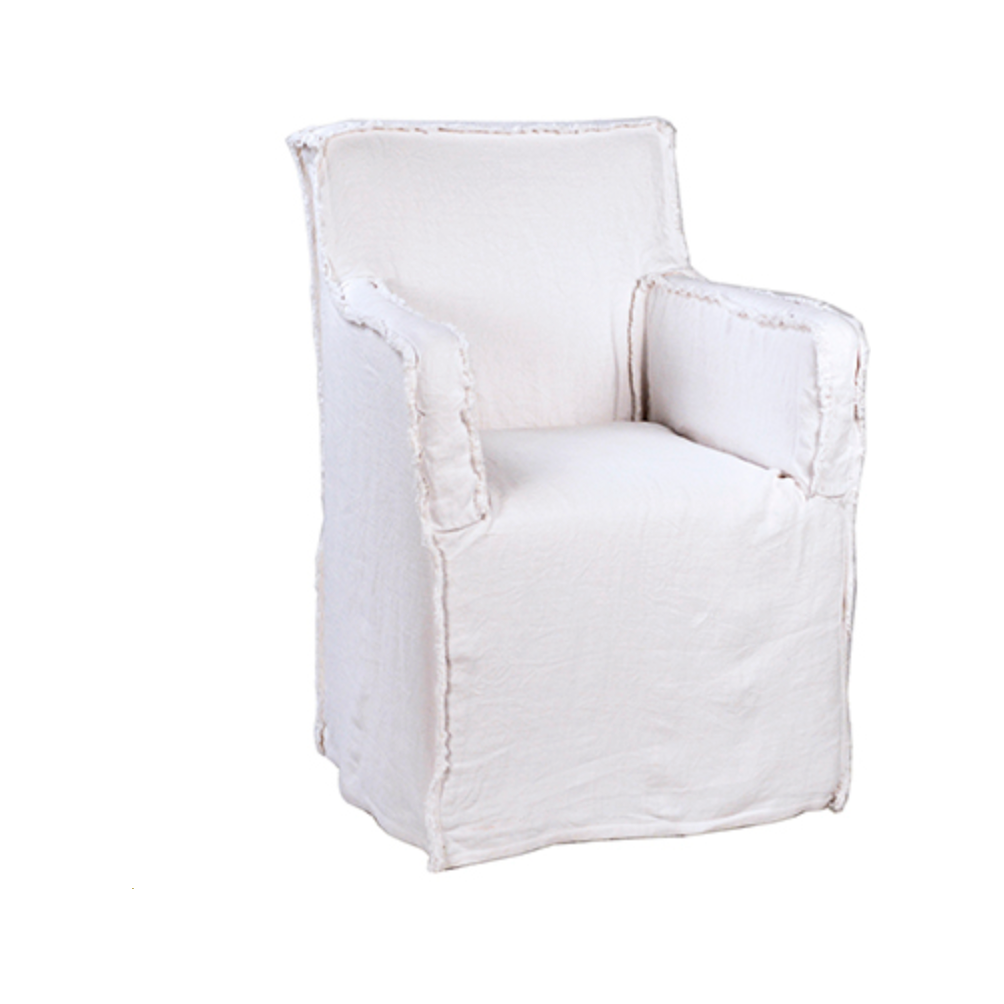 The Barlow Dining Chair is a stunning chair upholstered in a comfortable performance linen fabric with raw edge seams. The chair is constructed in a birch wood frame with casters.