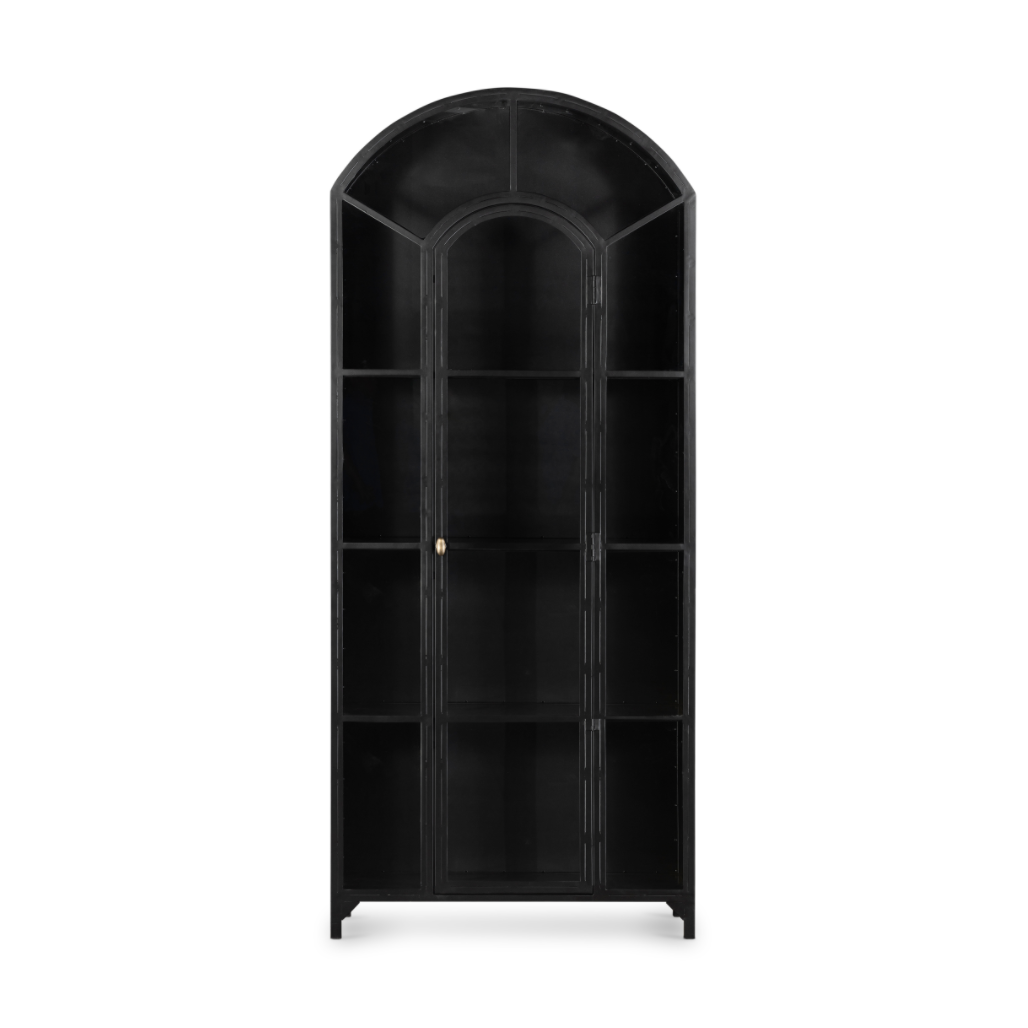Display barware, books, or other treasures in an arch-topped cabinet. Solid iron sheeting is finished in soft, matte black with contrasting brass hardware.