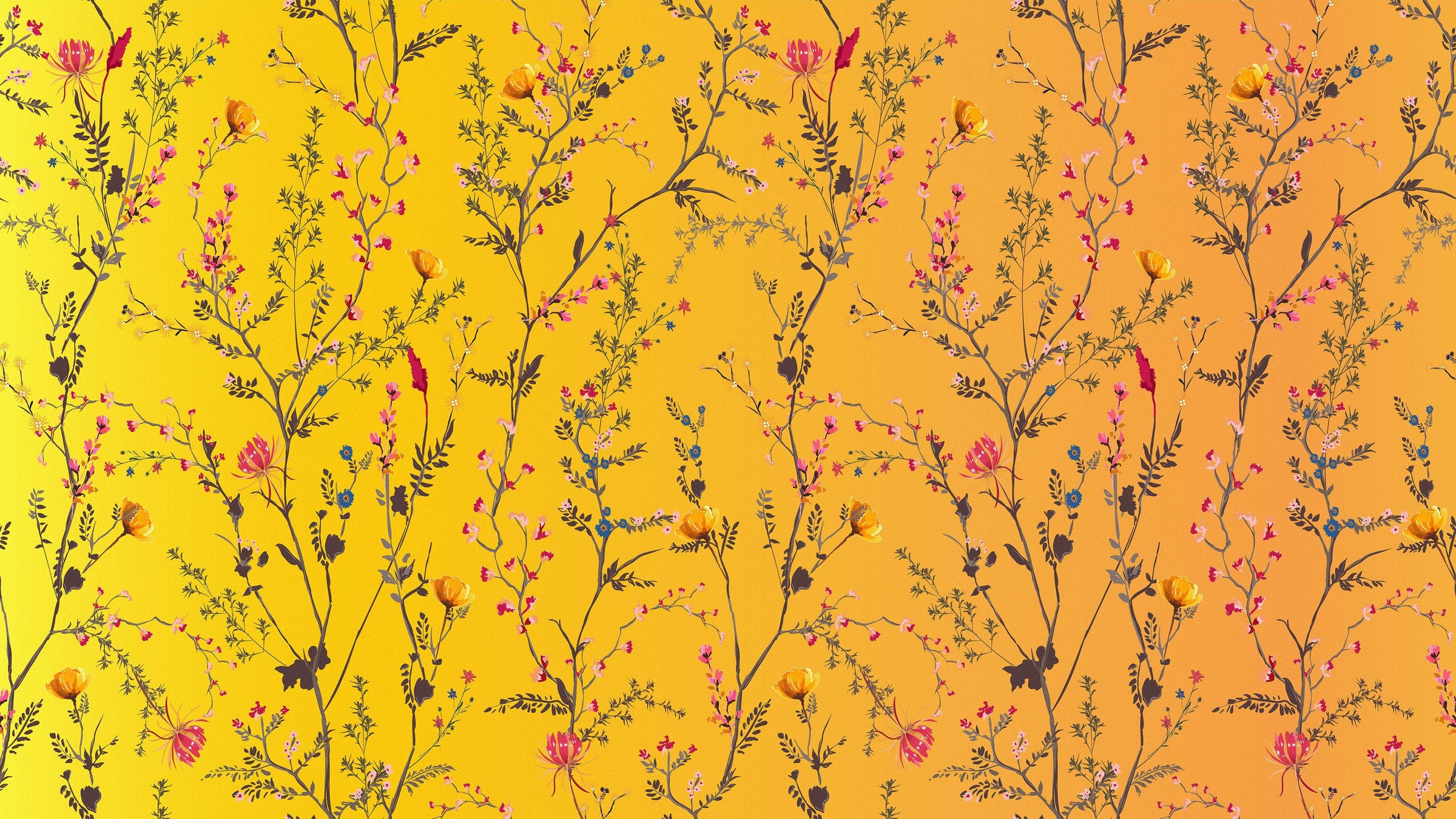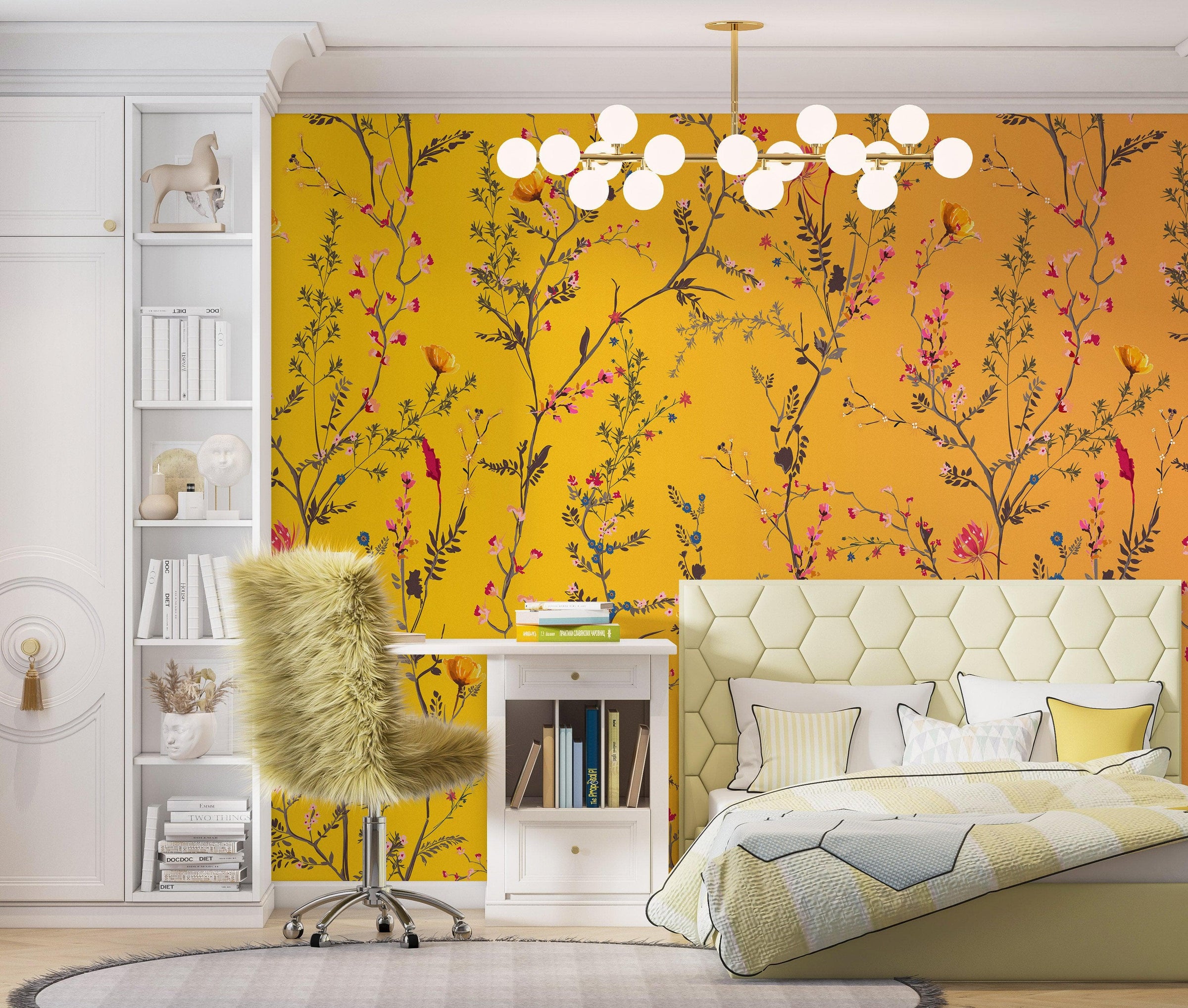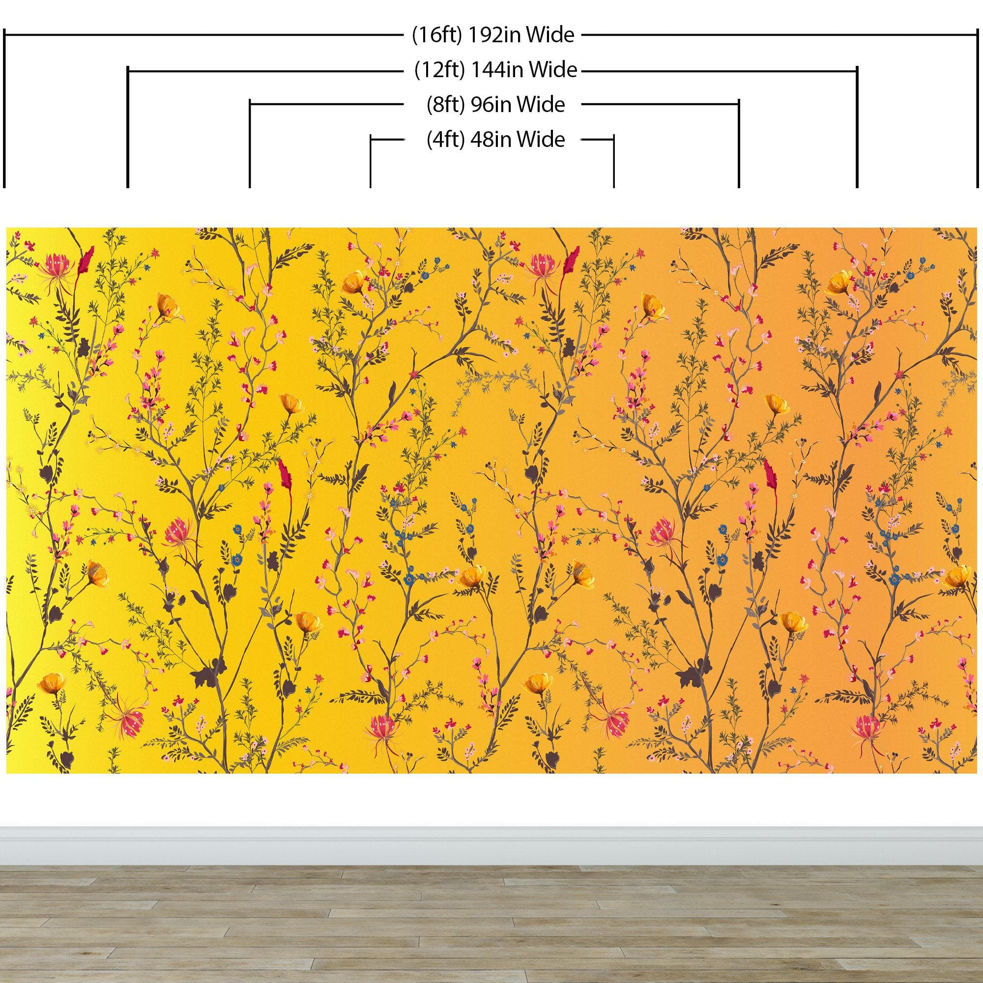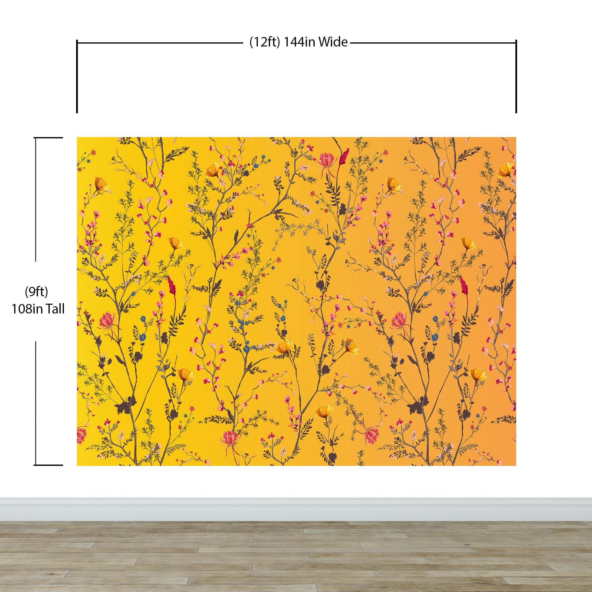 Botanical Flower Garden With Yellow Orange Background Wall Mural. Blossom Flower Decor. #6355