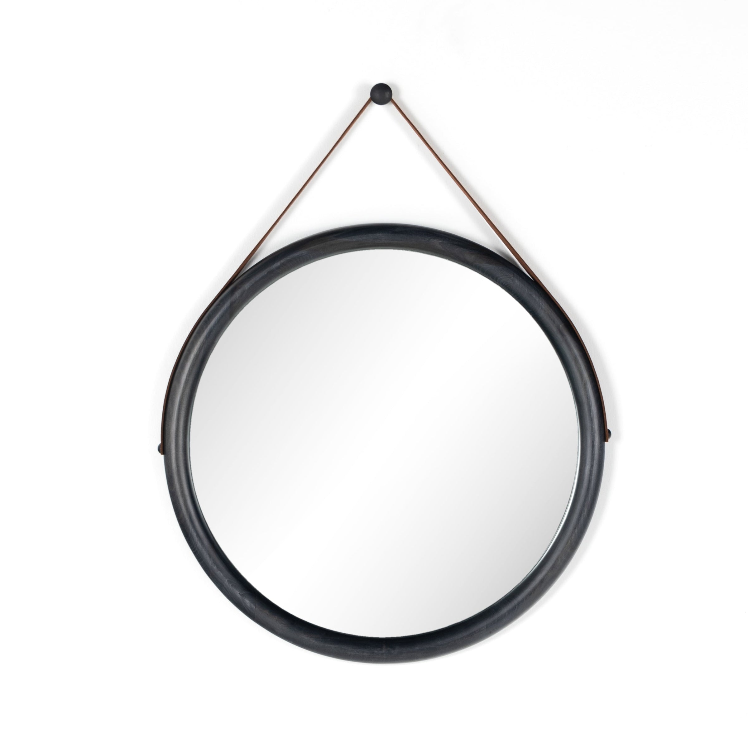 The Des Mirror is hung by a handsome, toffee-colored top grain leather strap. We love the fresh take on what would otherwise be a traditional, round mirror. The mirror is framed in black-washed popular and would like amazing hung in an entryway, bedroom, or other space.