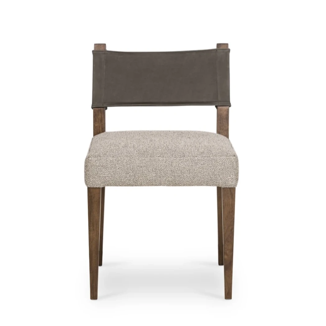 Mixed materials at their finest. Brown parawood forms a slight, simple frame for squared seating of neutral performance-grade upholstery. Charcoal top-grain leather backing takes this modern-minded dining chair to the next level.