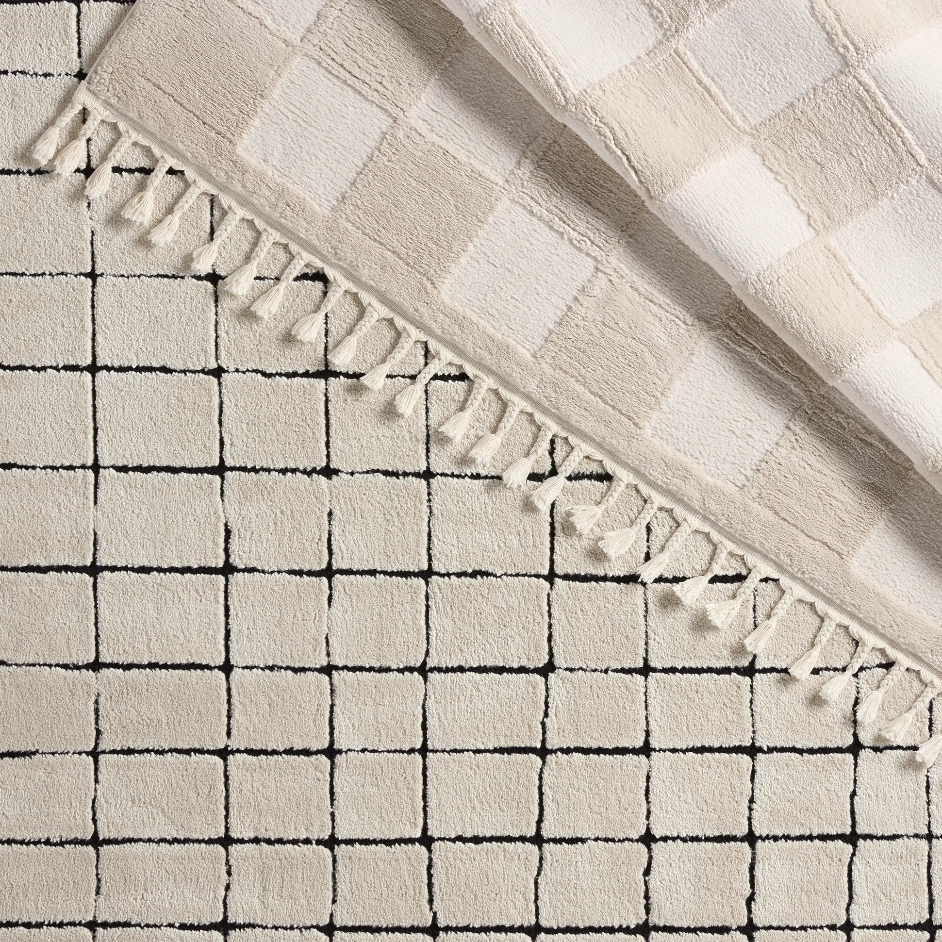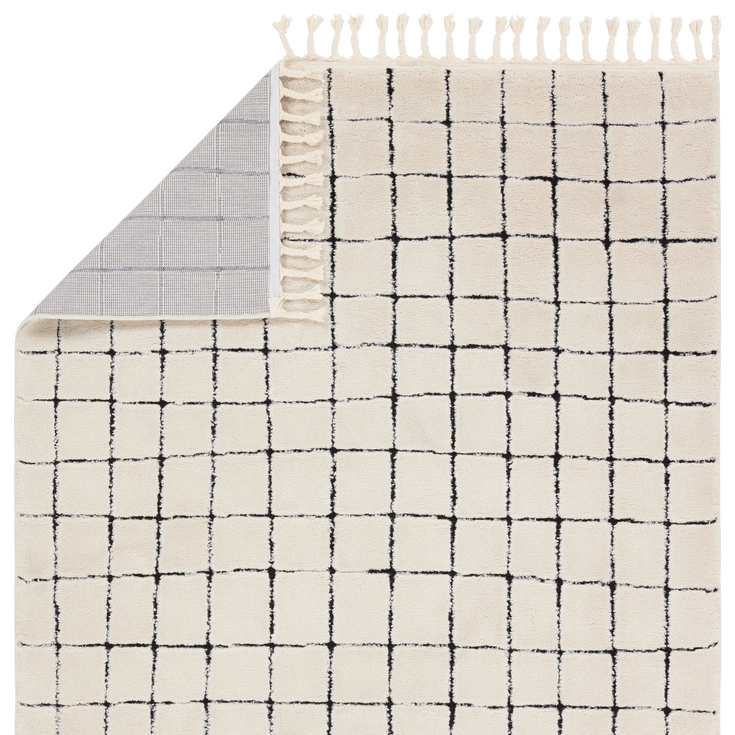 The Jaida collection is inspired by a coveted blend of modern Moroccan style and cozy, inviting vibes. These rugs showcase an incredibly soft hand, with a touch high-low detail mixed into the pattern, and a shed-free construction of polyester and polypropylene. The braided, cream fringe paired with an ivory and black grid pattern of the Align rug provides visual texture and global appeal. This plush area rug thrives in high traffic areas of the home such as living rooms, foyers, halls, and sunrooms.