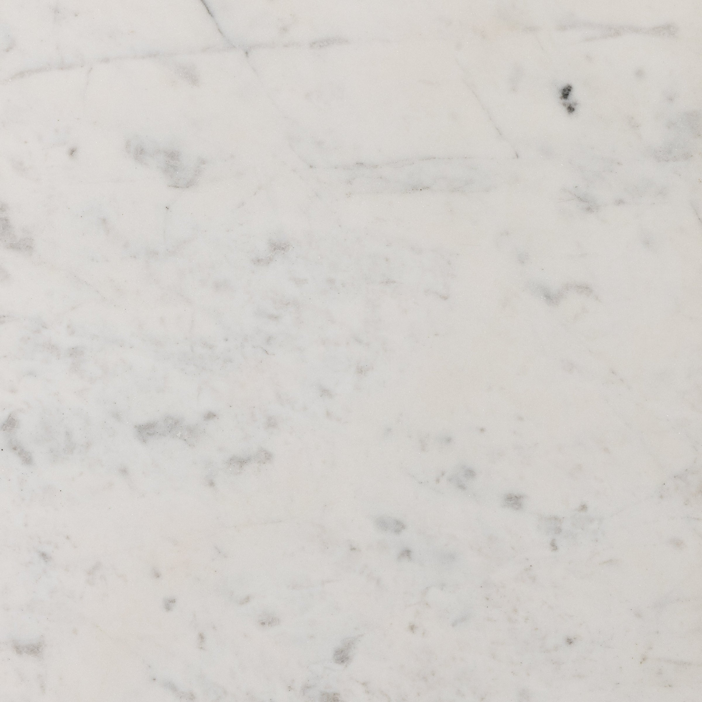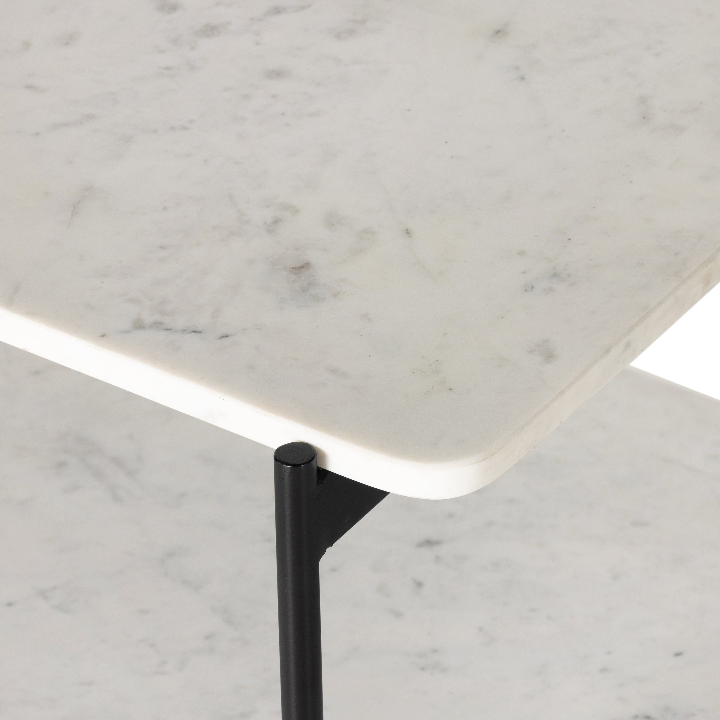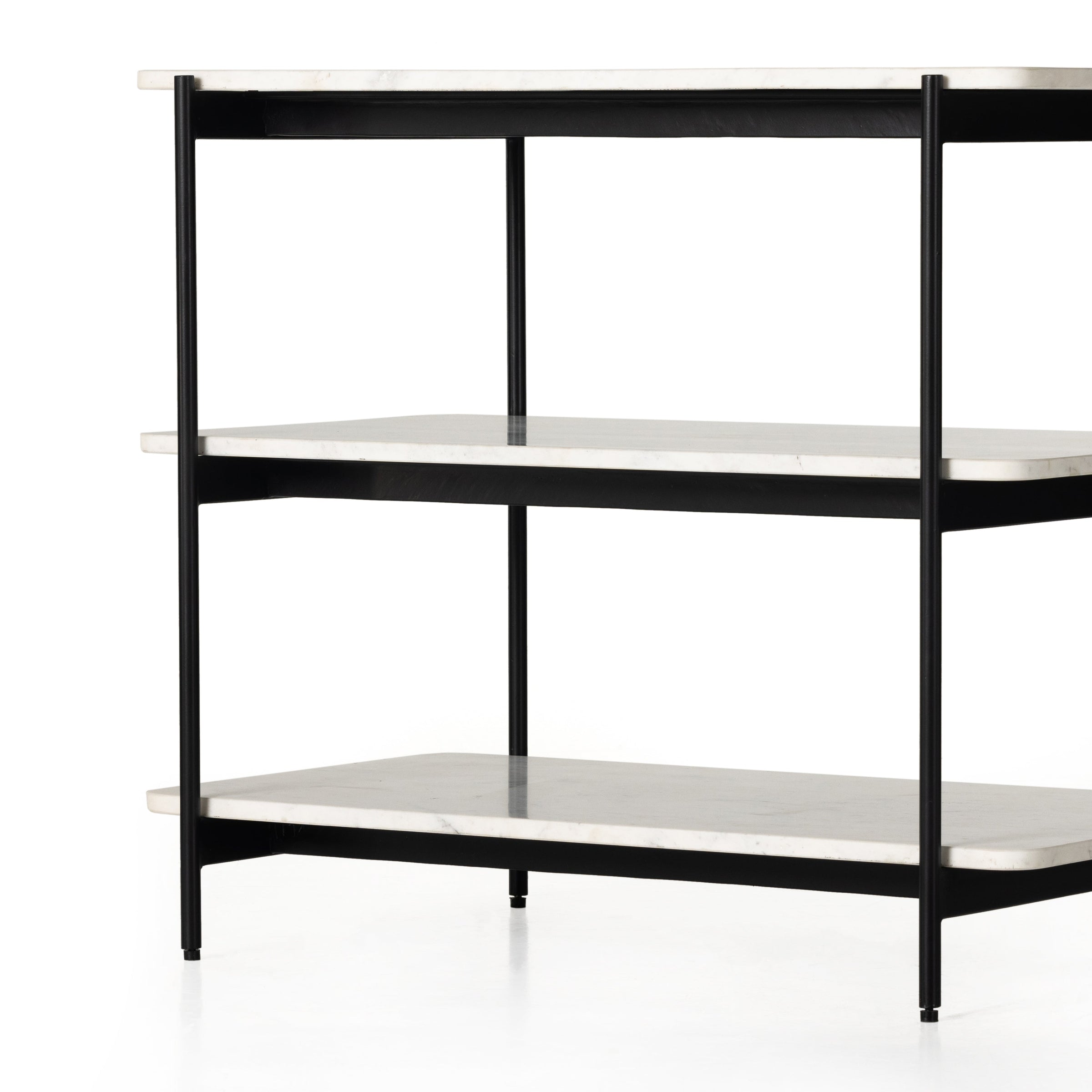 Jasper Nightstand is a black-finished iron forms a slim, airy frame for open shelving of polished white marble.