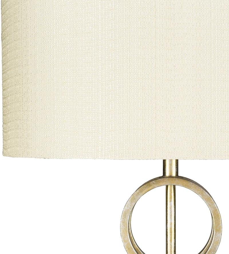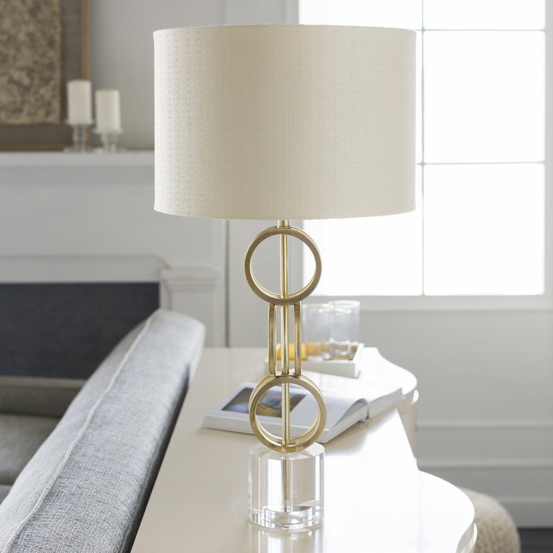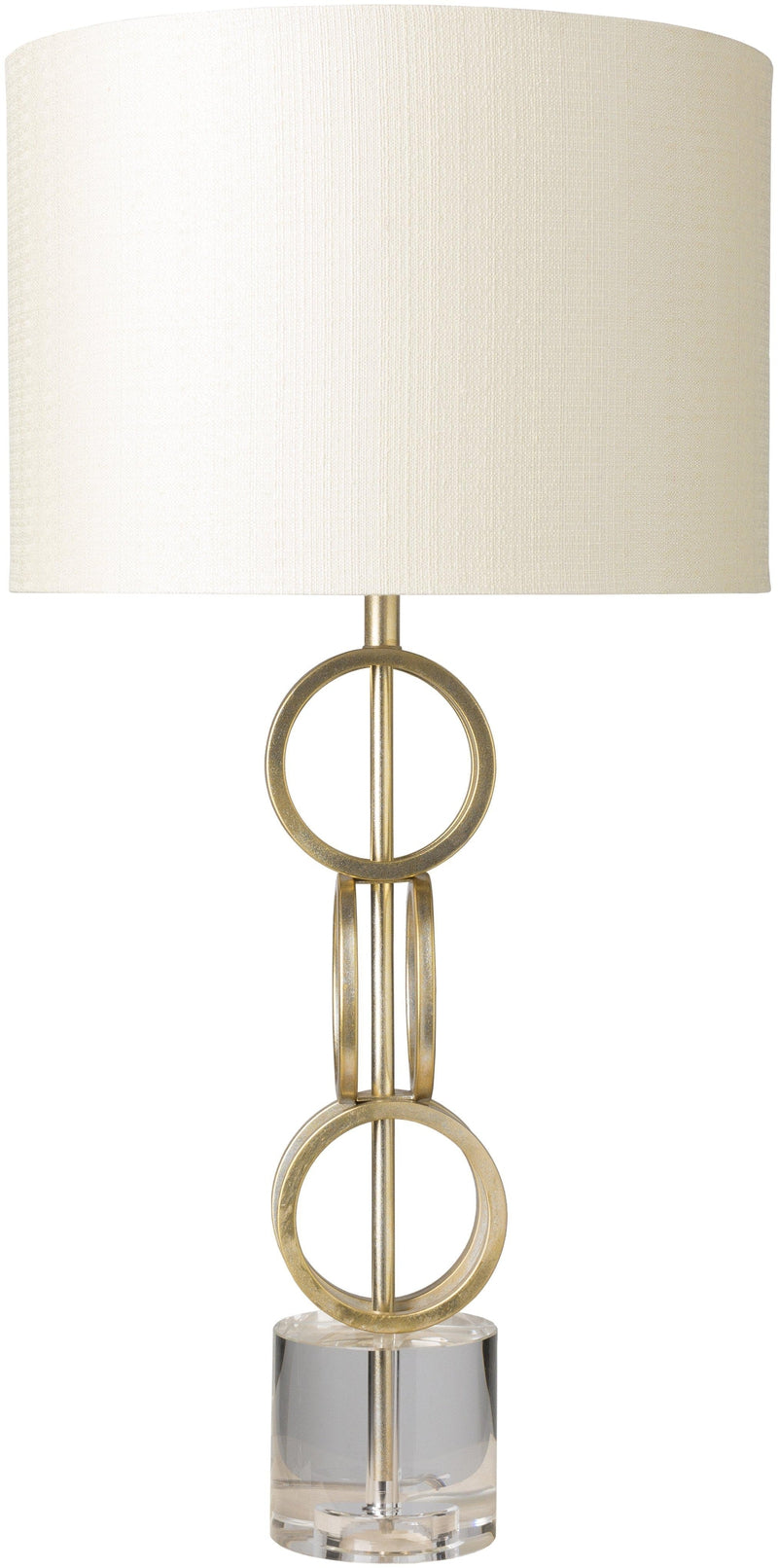 - Body: Gold; Base: Clear; Finial: Gold; Harp: Metallic - Brass Linen Shade
