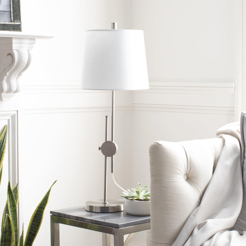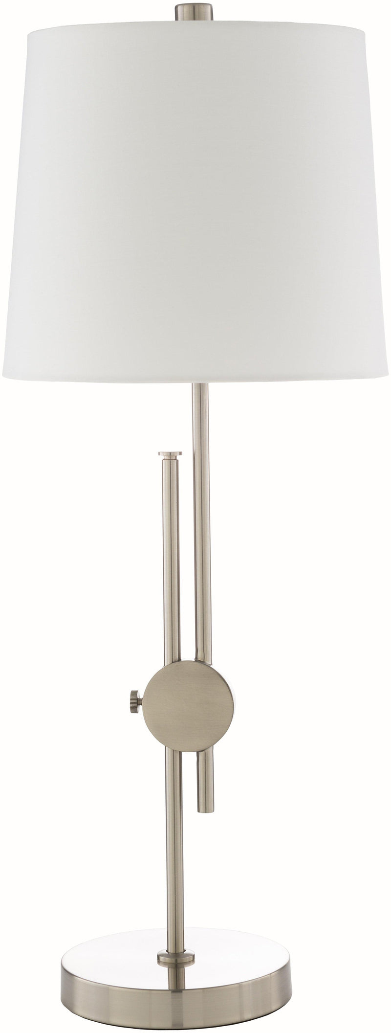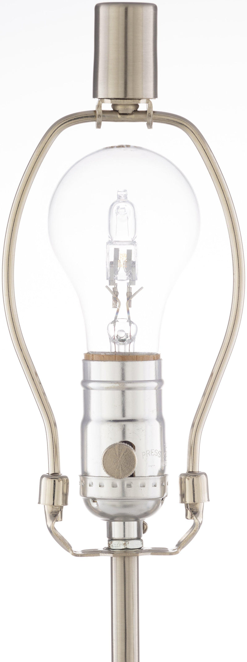 • Color: Body: Metallic - Nickel; Base: Metallic - Nickel; Shade (Outside): Ivory; Shade (Inside): White; Finial: Metallic - Nickel; Harp: Metallic - Nickel; Cord: Translucent