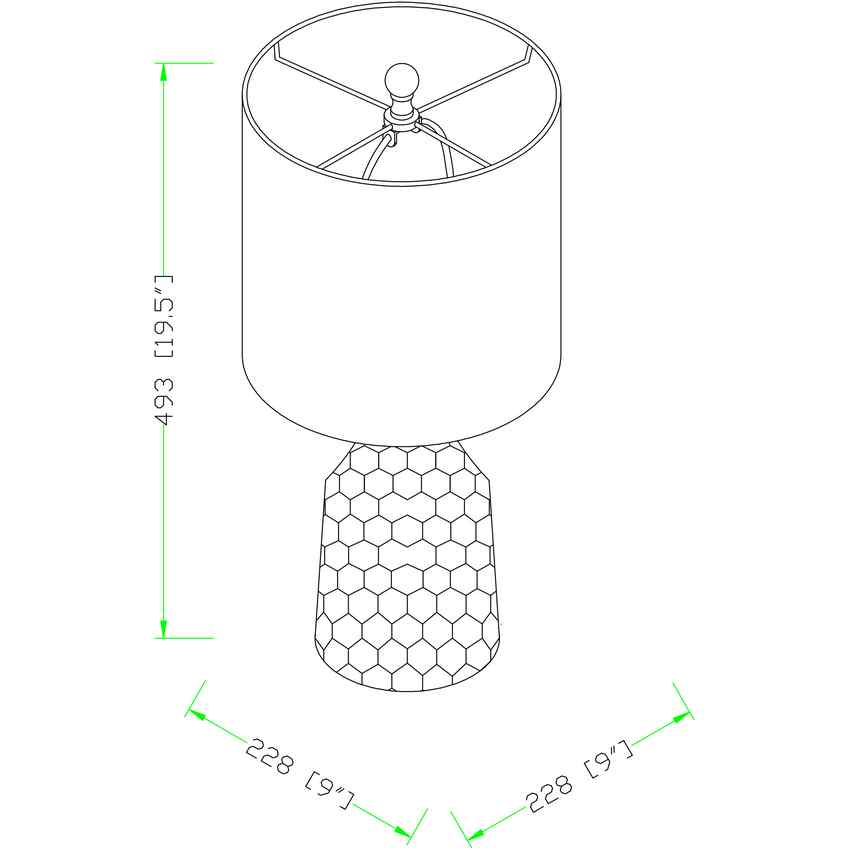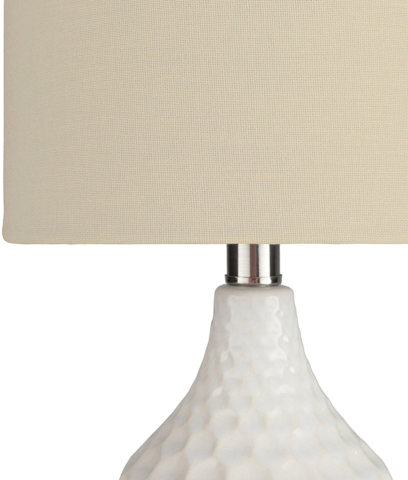 - Color: Body: White; Shade (Outside): Ivory; Shade (Inside): White; Finial: White; Harp: Metallic - Nickel; Cord: Translucent