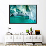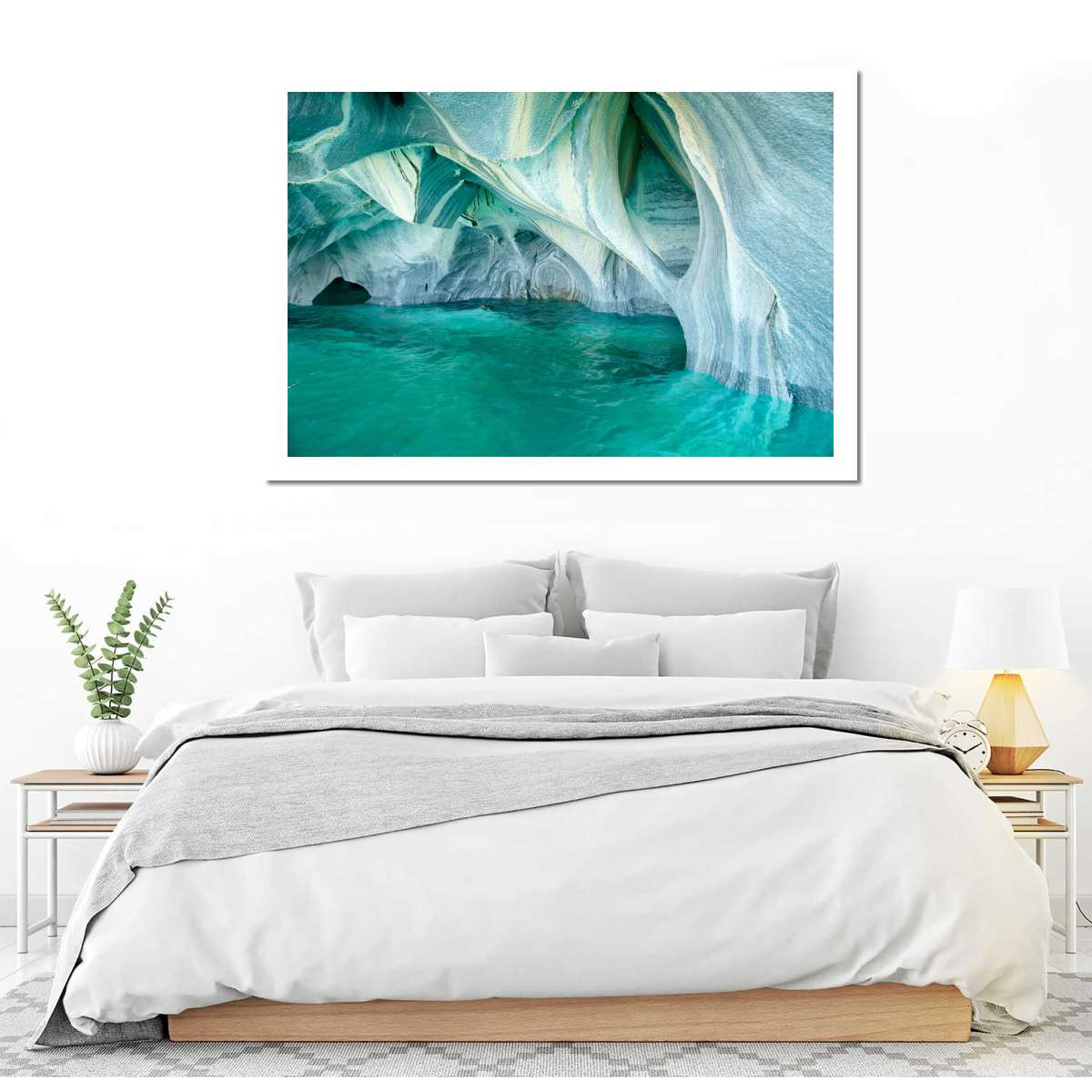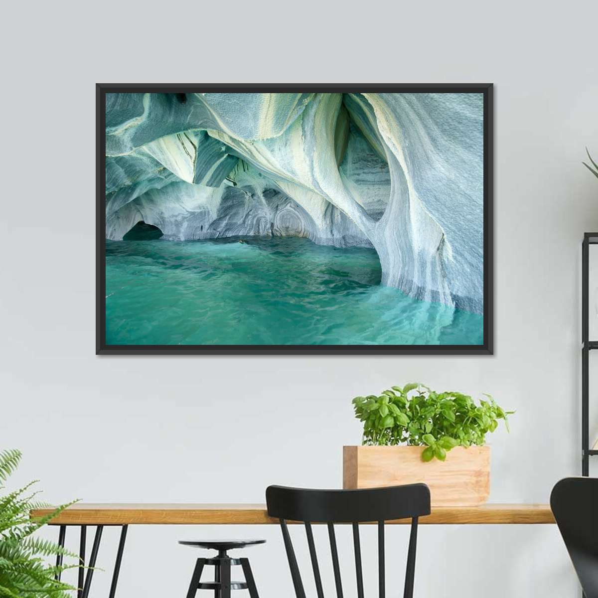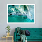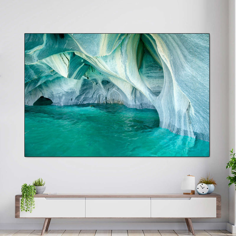 Marble Caves Carrera Lake Wall Art will refresh your mind and soul whenever you stop and stare at it. This high-quality art print will complement any room in your home and soothe your senses with nature's beauty.