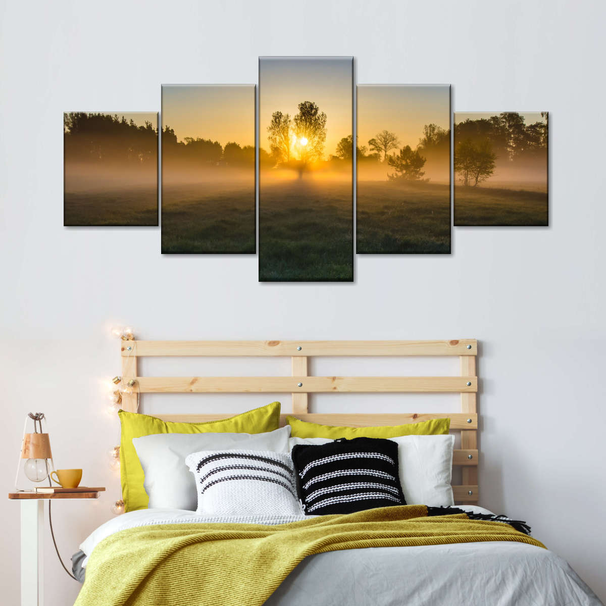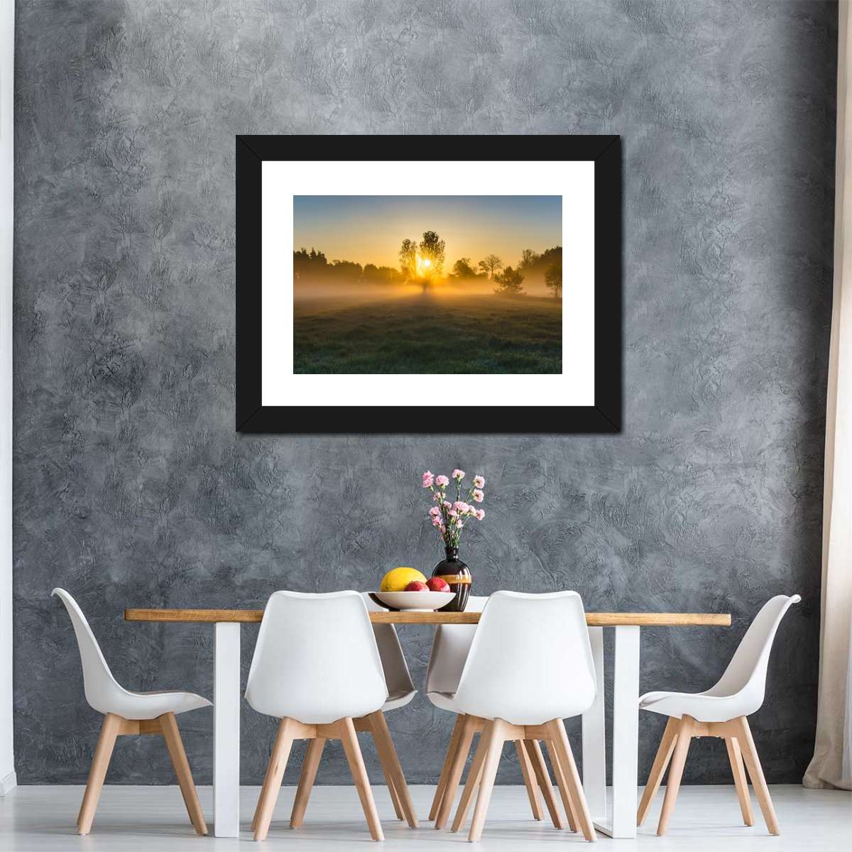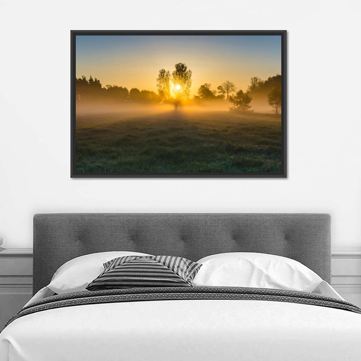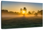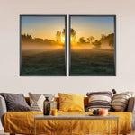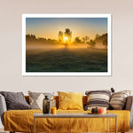 Misty Meadow At Sunrise Wall Art will refresh your mind and soul whenever you stop and stare at it. This high-quality art print will complement any room in your home and soothe your senses with nature's beauty.