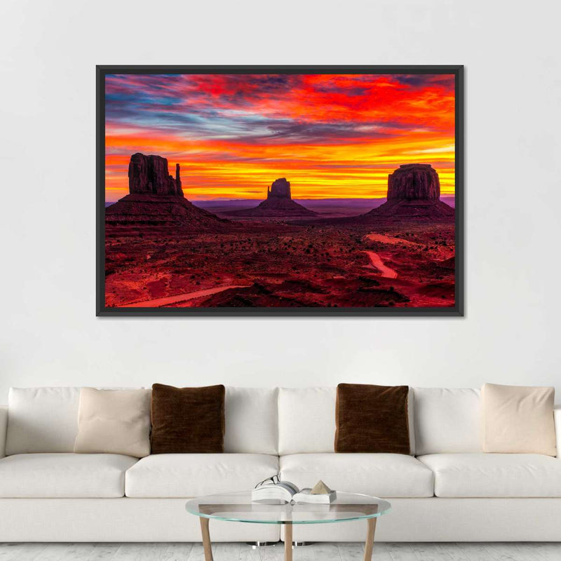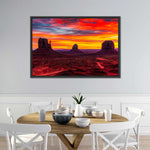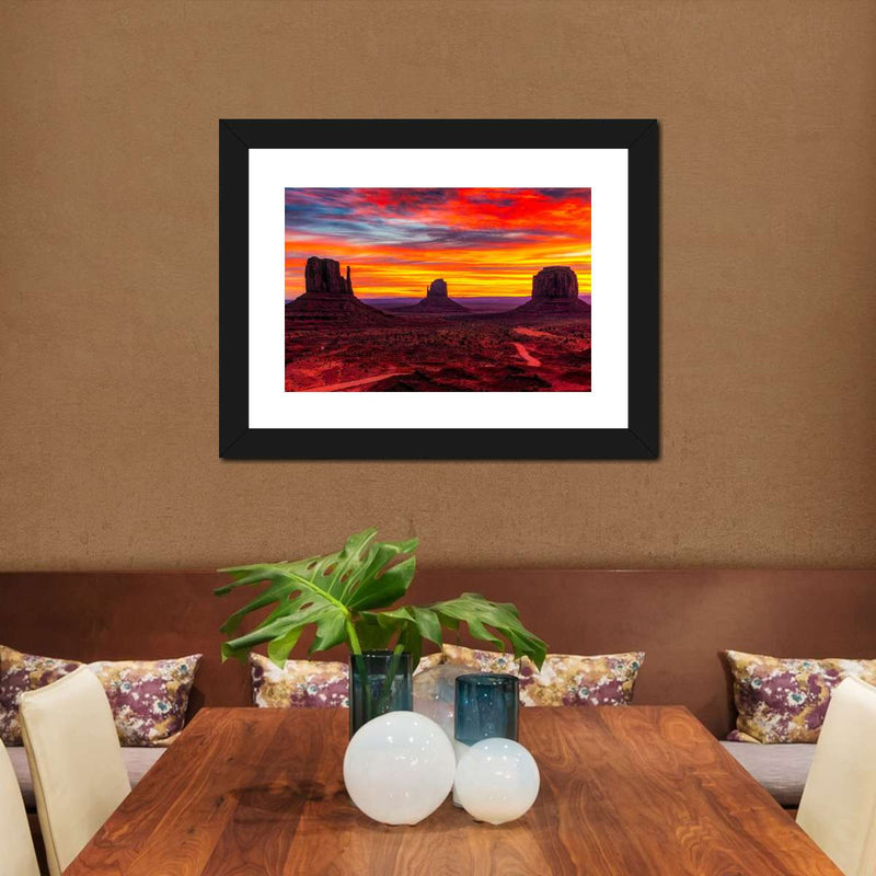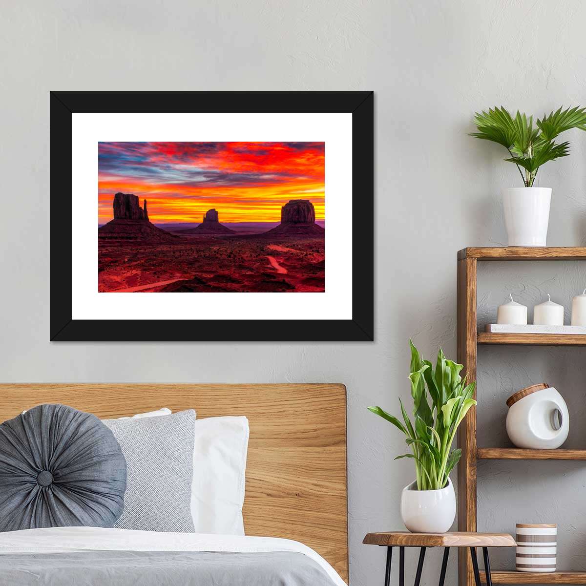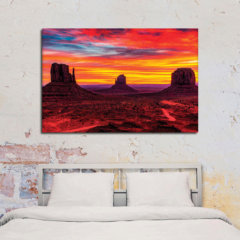Monument Valley At Sunset Wall Art will refresh your mind and soul whenever you stop and stare at it. This high-quality art print will complement any room in your home and soothe your senses with nature's beauty.