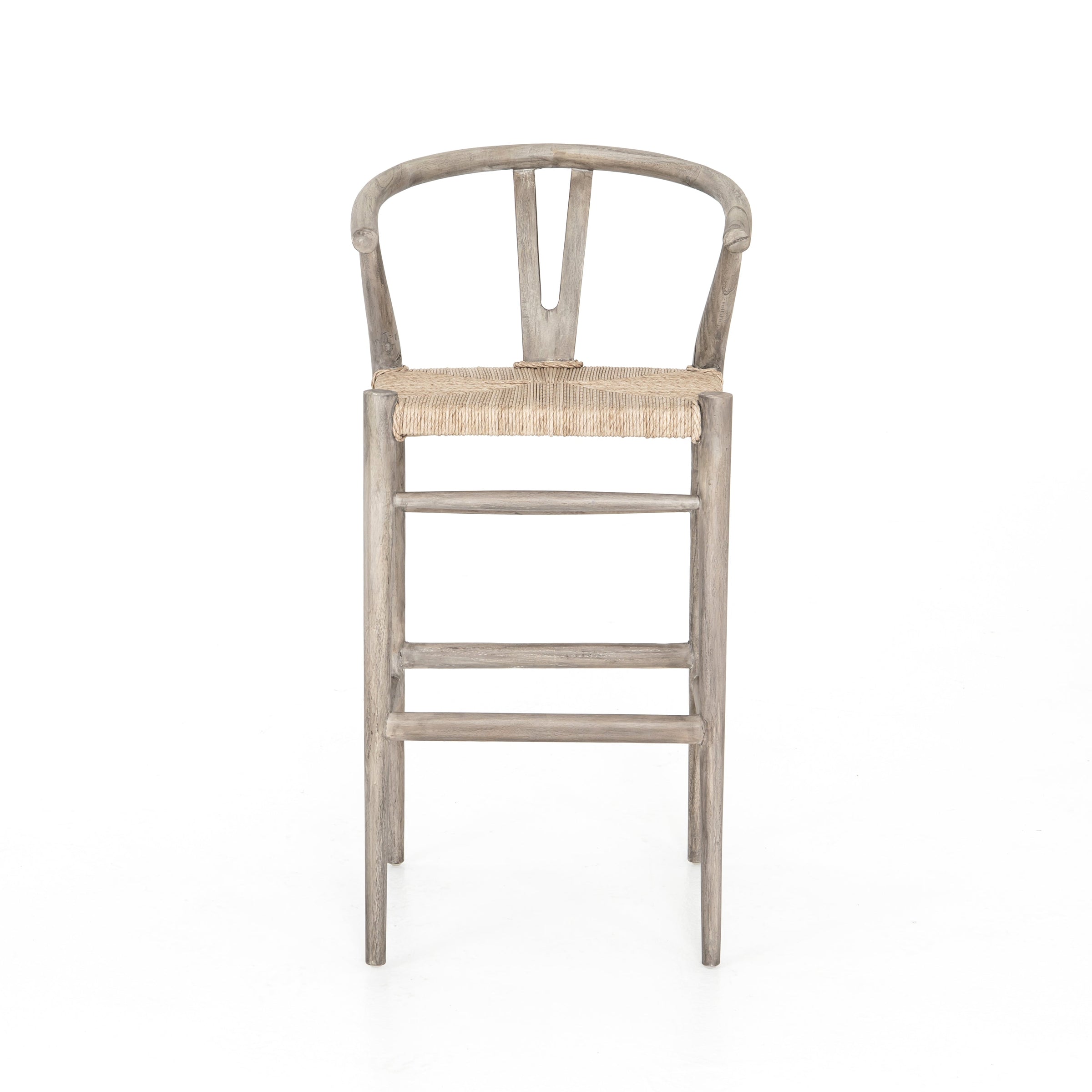 Modern curves redefine the classic wishbone-style counter stool. Vintage white all-weather wicker is woven for a dose of fresh texture within weathered grey teak framing. Cover or store indoors during inclement weather and when not in use.