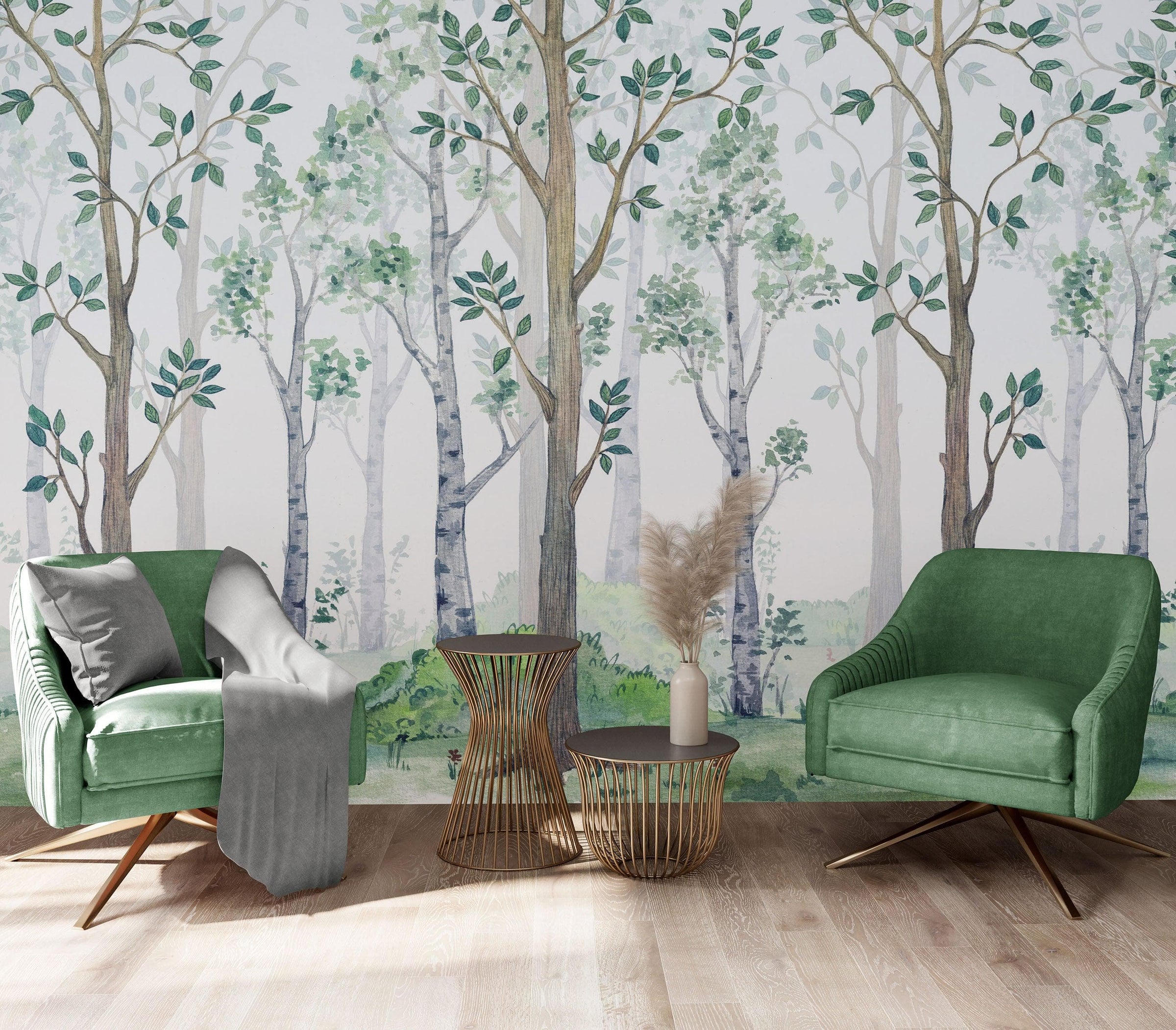 Nursery Woodland Forest Wallpaper. Watercolor Birch Tree Forest Wall Mural. #6525