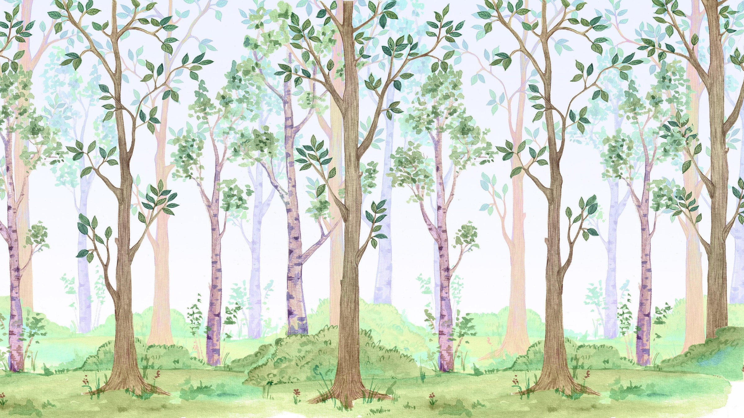 The design features a whimsical birch tree forest, with delicate watercolor tones that give the wallpaper a soft and gentle feel. The trees are depicted in shades of white and gray, with leaves and branches that extend gracefully across the wallpaper. The background is a subtle wash of blue, green, or lavender, adding to the tranquil atmosphere.