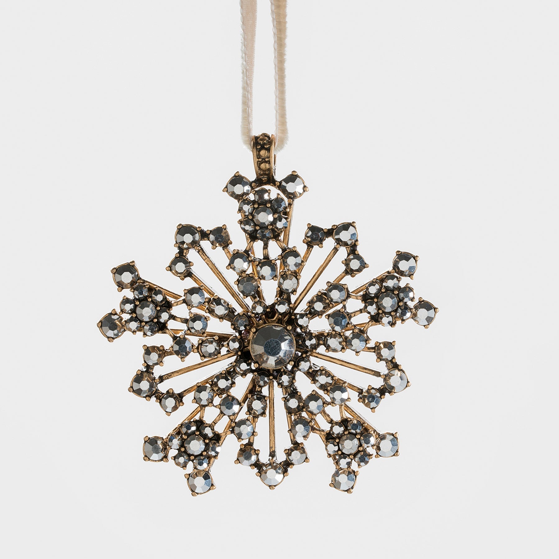 This sparkling snowflake ornament adds glamour and fun to your holiday decor with its shimmering glass gems, gold ox plating and luxe Swiss velvet ribbon.