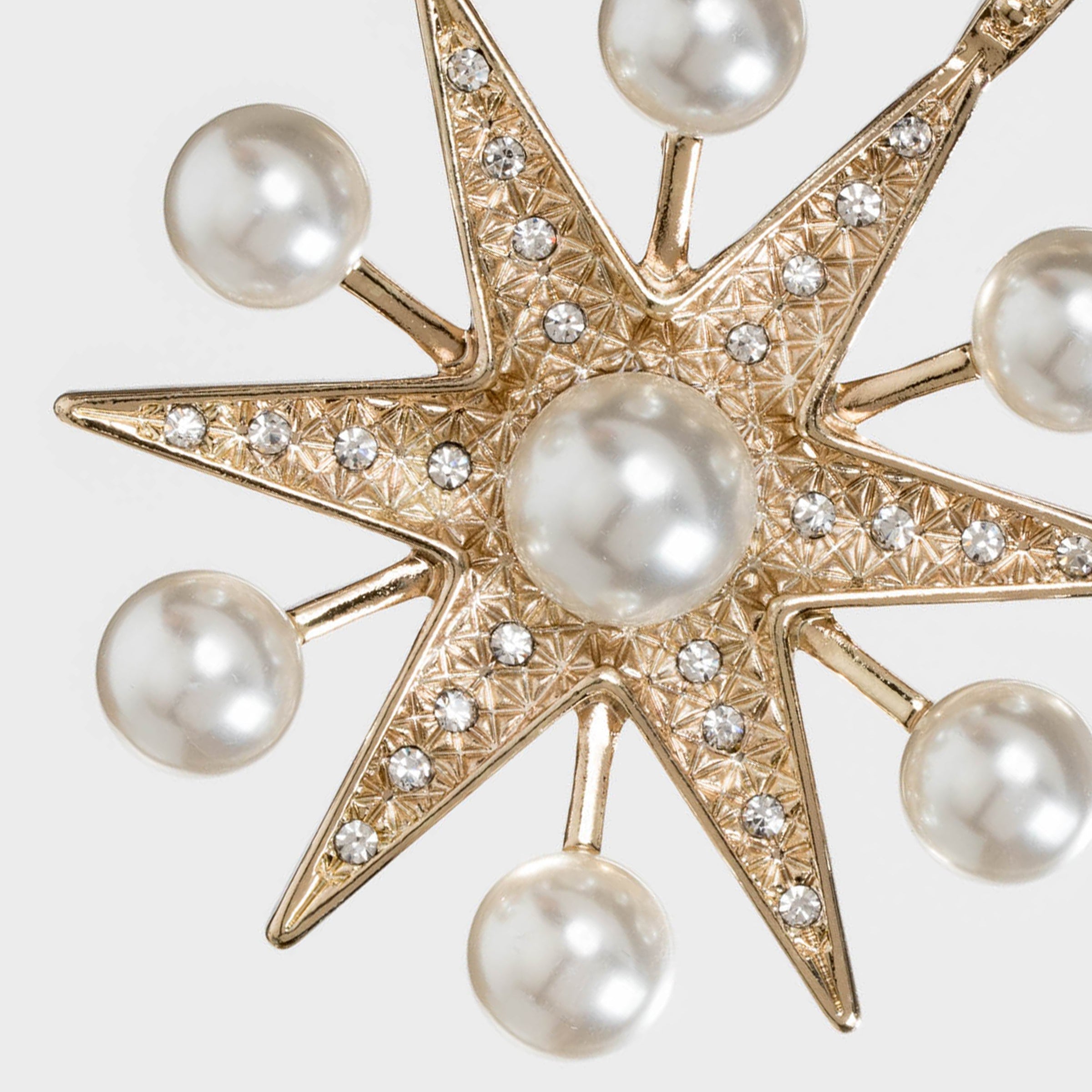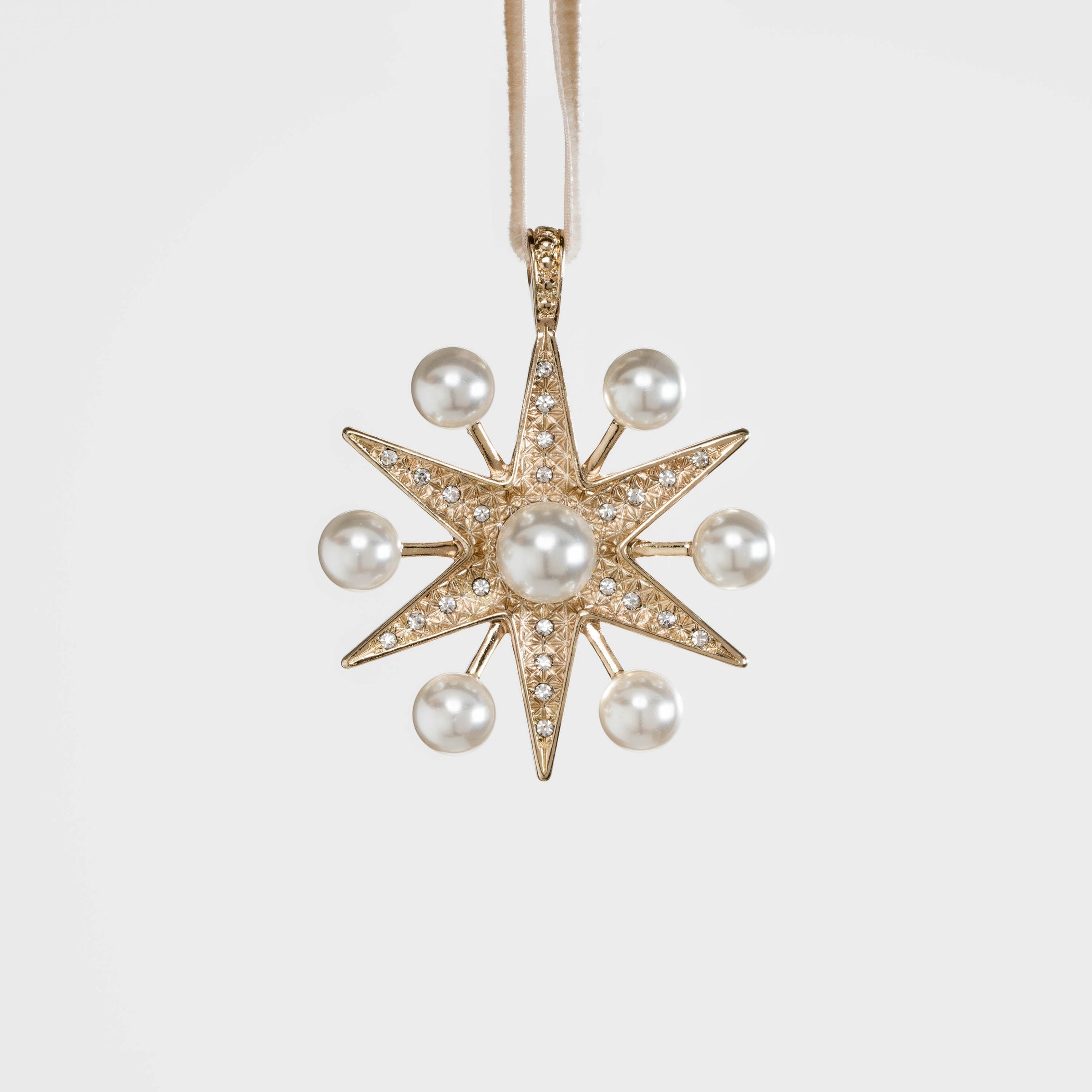 Inspired by the night sky and planets, this space-age, pearl star hanging ornament should be floating around ready to light up any tree! Tons of detail on this piece, truly a future heirloom!