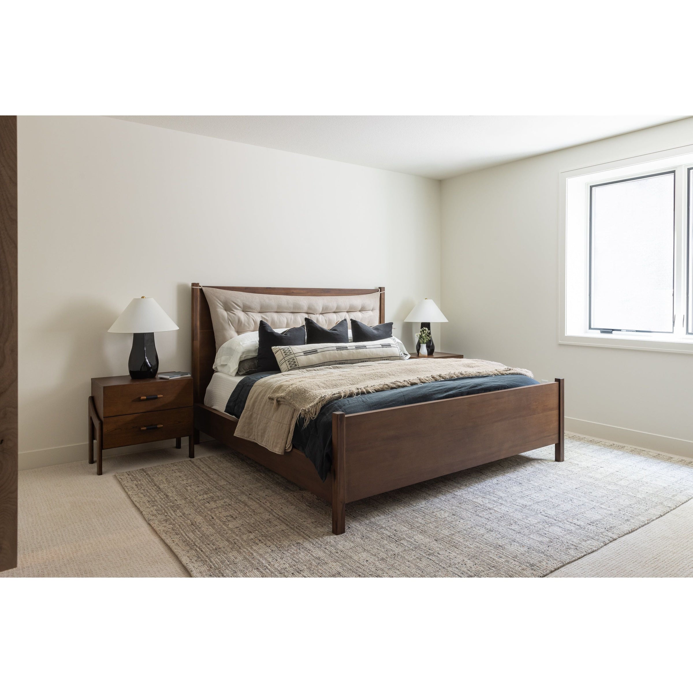 A simple, heavy wood bed frame with a removable sling cushion in a neutral fabric with blind button tufting. Choose the all-wood look or opt for a softer look with the pillow. The cushion is reinforced at the corners for added durability and easily removed for cleaning.