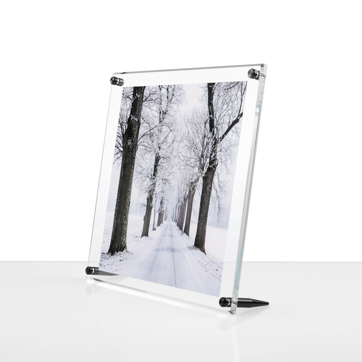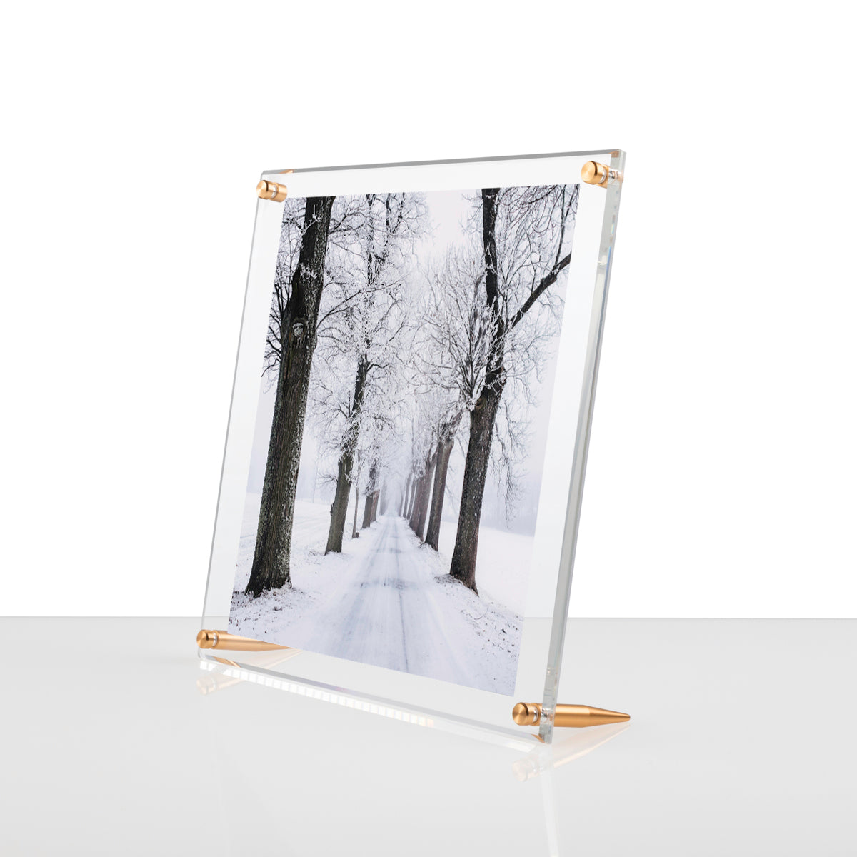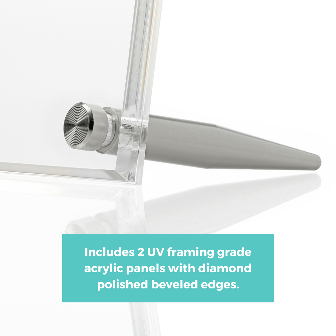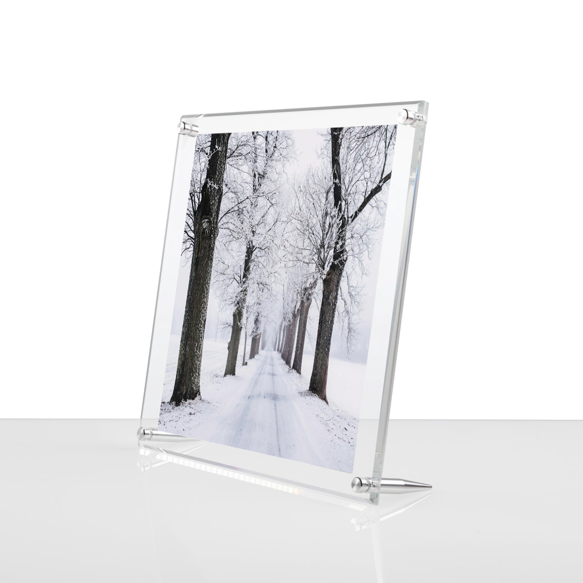 Stunning, Diamond polished beveled edge acrylic tabletop frame. Choose between floating 4"x6", 5"x7", 8"x10", 9"x12" or 10x10" photos. Stands vertically or horizontally.