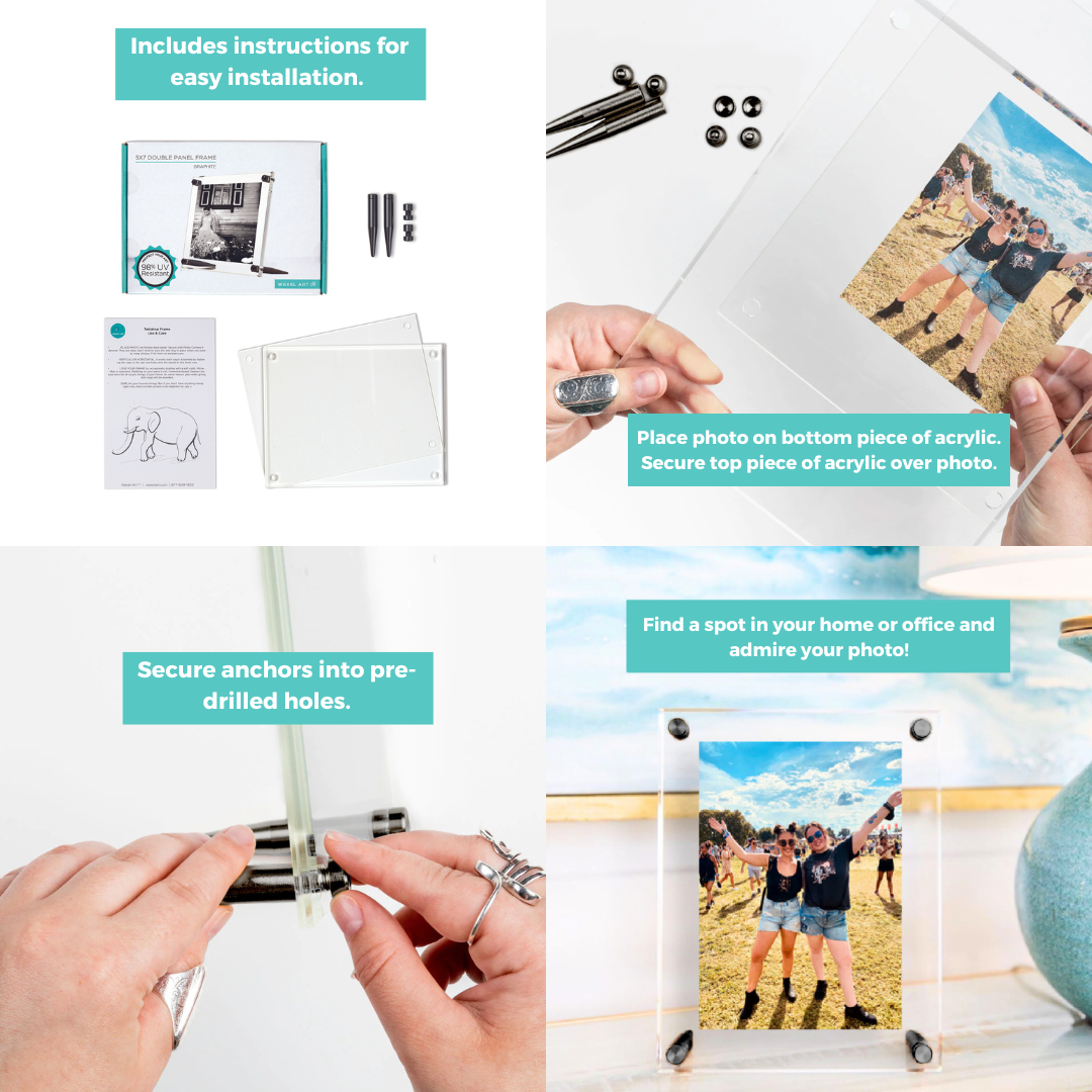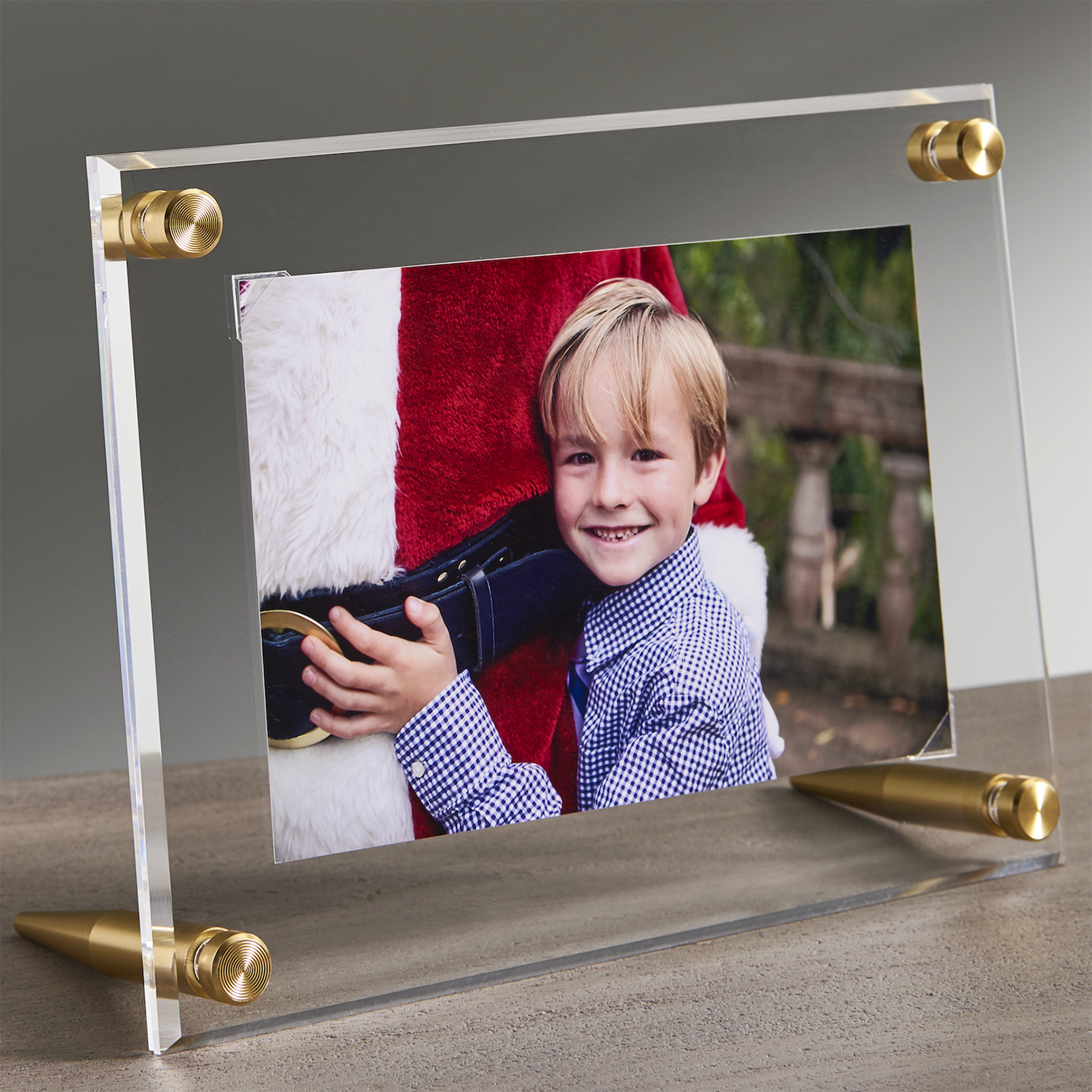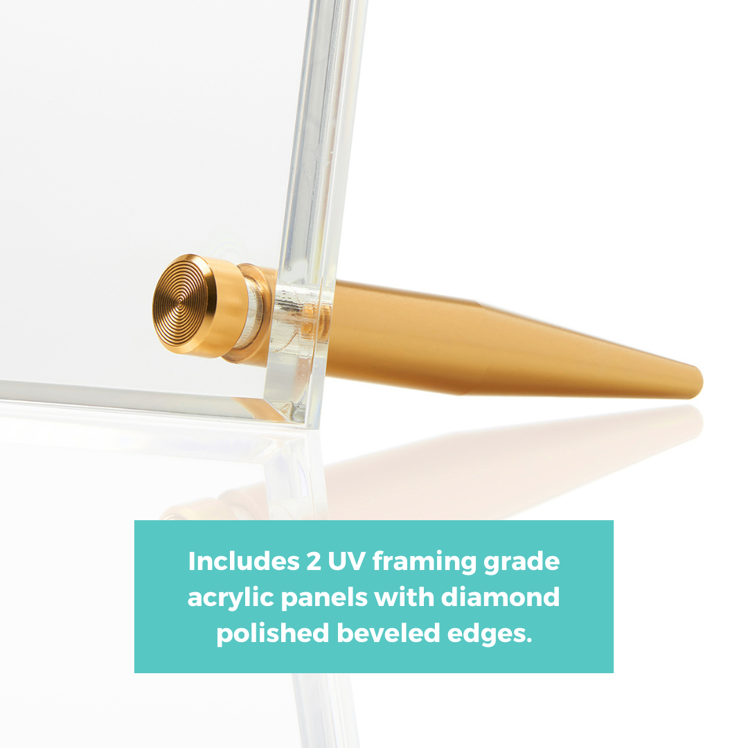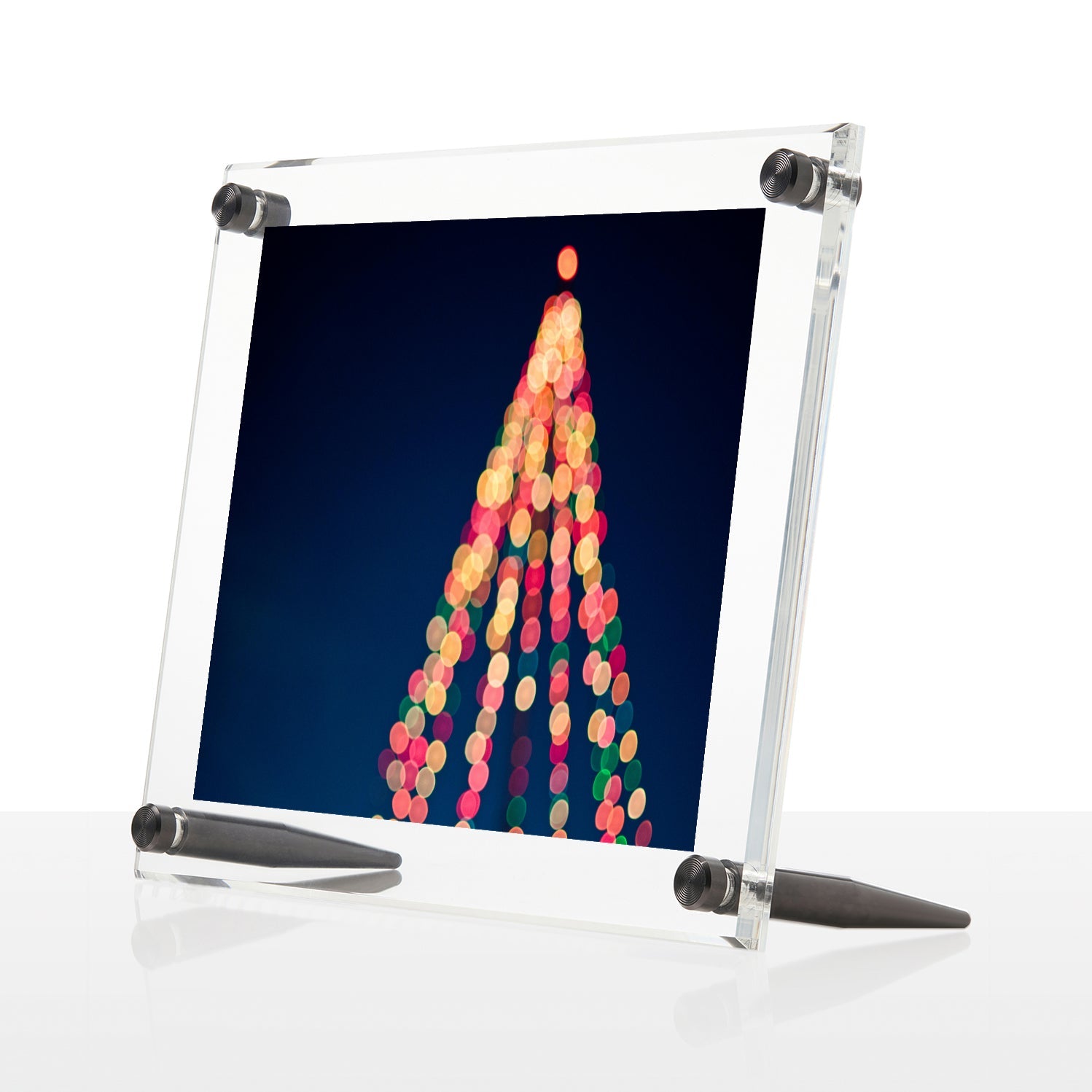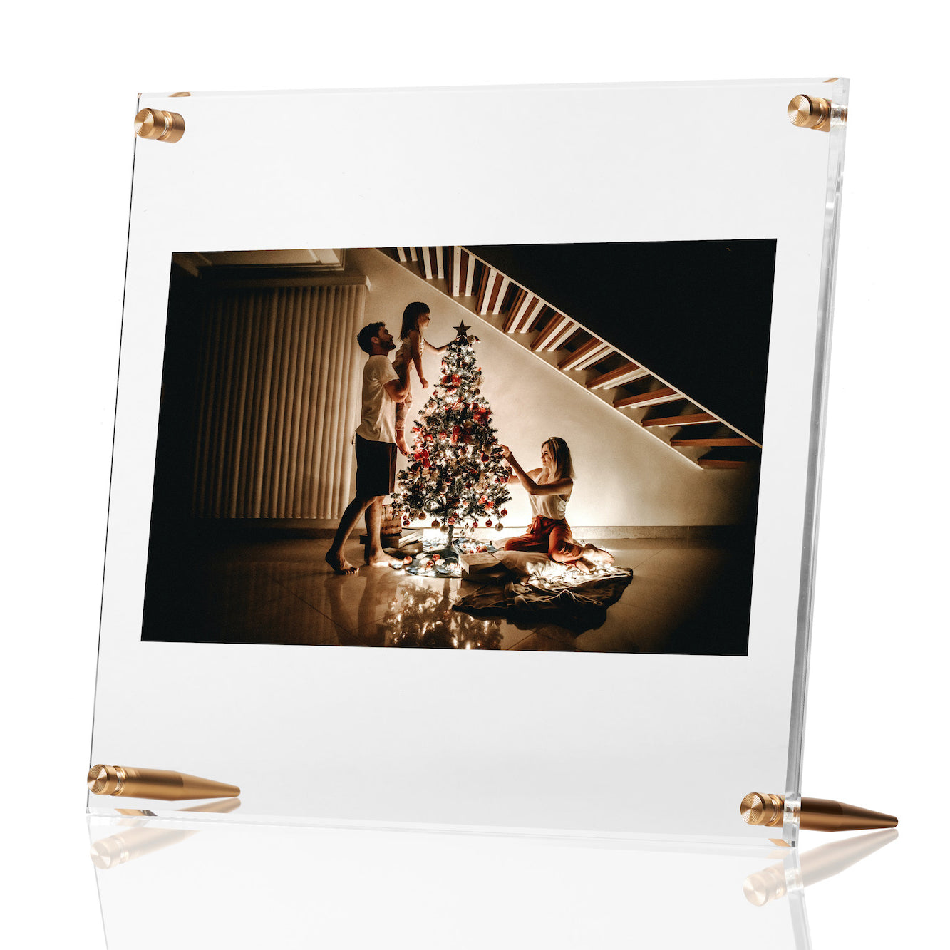 Stunning, Diamond polished beveled edge acrylic tabletop frame. Choose between floating 4"x6", 5"x7", 8"x10", 9"x12" or 10x10" photos. Stands vertically or horizontally.