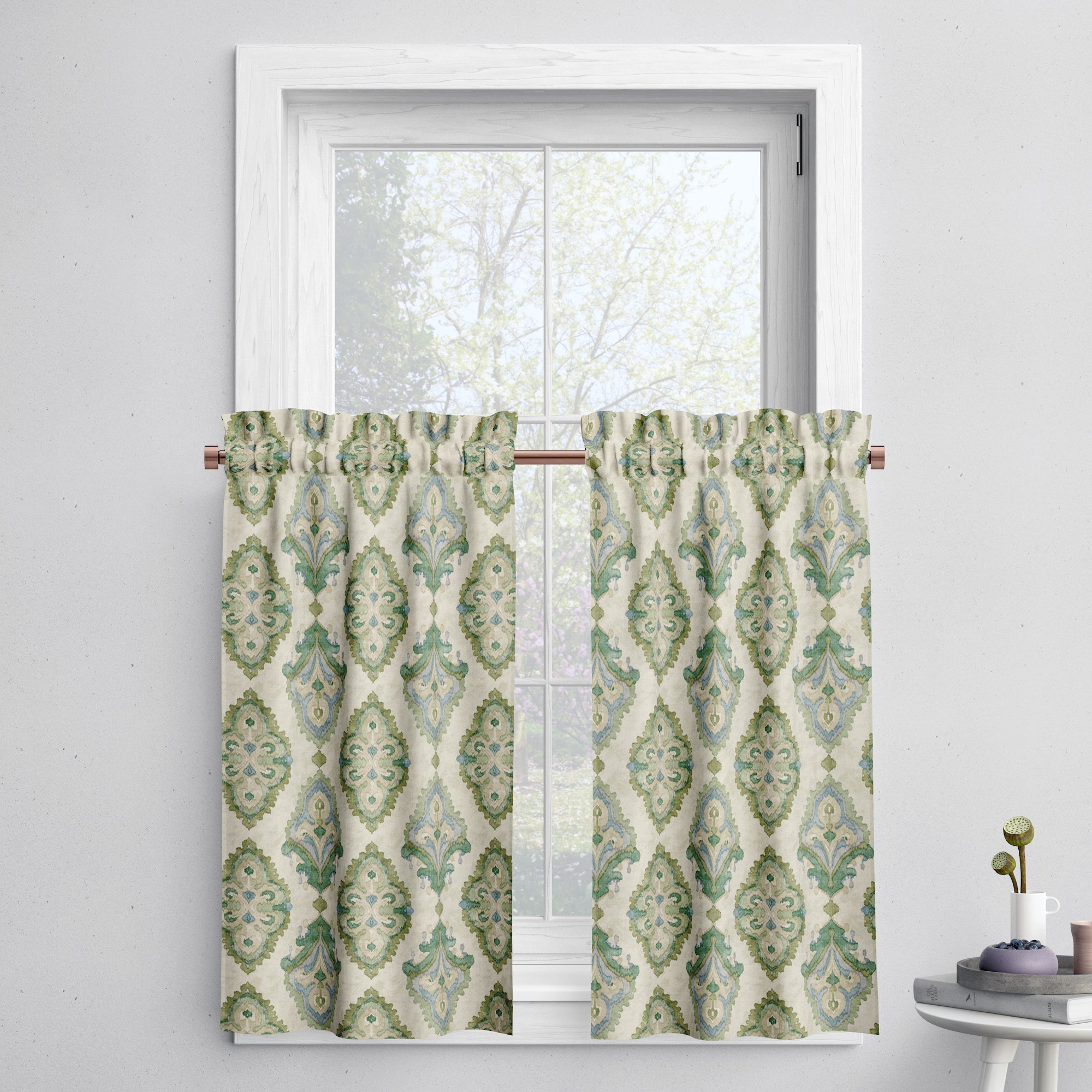 Tailored Tier Cafe Curtain Panels Pair in Queen Bay Green, Blue Medallion Watercolor- Large Scale