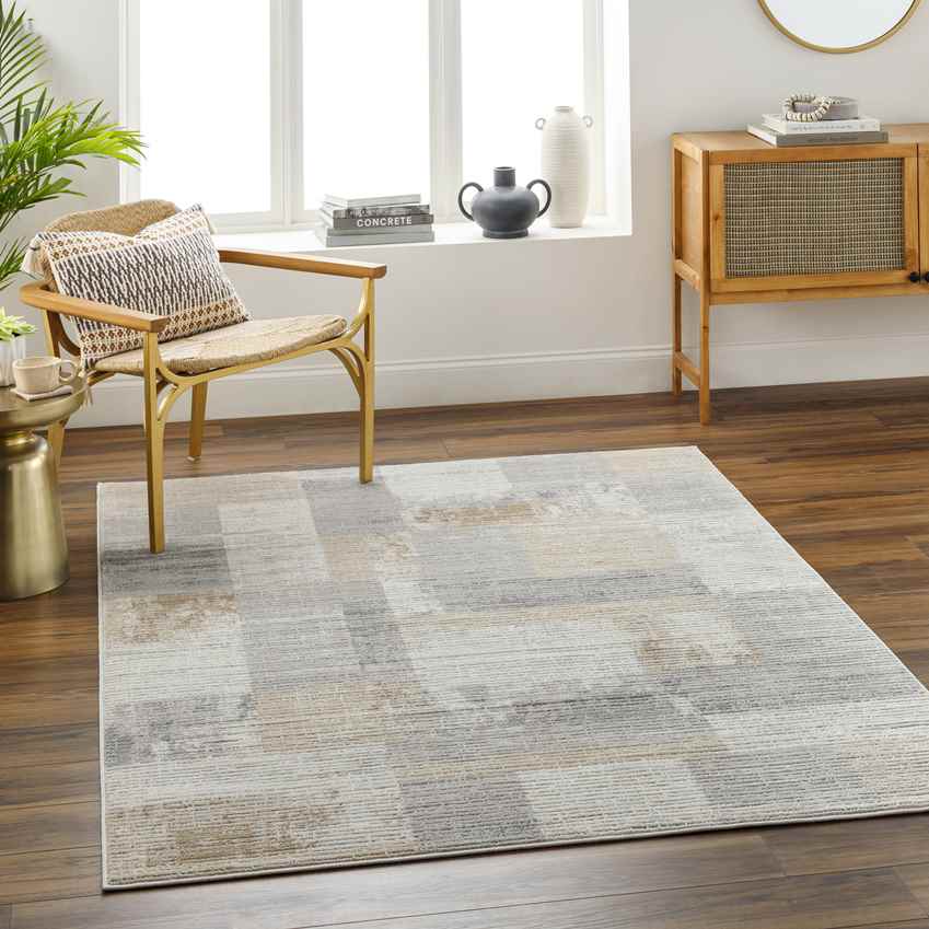 Designed to adapt to various decor styles, this rug offers a versatile aesthetic that complements both modern and traditional settings. Its harmonious blend of colors, including charcoal, tan, off-white, plum, dusty pink, and navy, creates visual interest and adds depth to your interiors. The Treavor Modern Light Gray Area Rug is perfect for any room, whether it is a bustling family area or a serene retreat.ÂÂ
